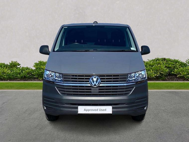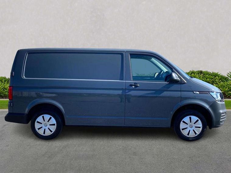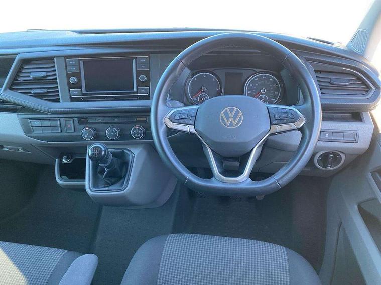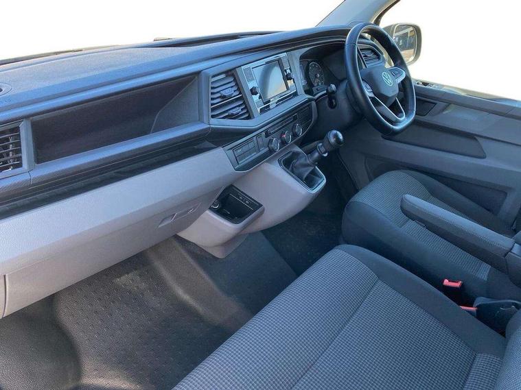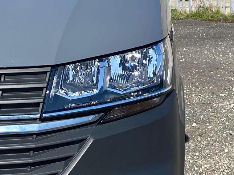 Cross wind assist, Dimmable illuminated instruments, Driver alert with Multi-function display plus, eCall emergency system, Forward collision warning front assist with autonomous emergency braking, Mobile phone interface, Multi function display plus with black and white display, 2 USB interfaces type C in dashboard, 4 speakers with 2 tweeters and 2 woofers, Composition colour radio with 6.5" touchscreen, Digital radio reception (DAB+), Volkswagen app connect, Closing rear wing door with unlatching from the inside, H7 twin halogen headlamps, Heat insulating glass (green) in cab and passenger/load compartment, Heat insulating windshield made of laminated glass, Left convex exterior mirror, Rear wing doors without window apertures, Right convex exterior mirror, Separate Daytime running lights, Transporter nameplate on the rear fender, Unpainted radiator grille with 2 chrome trims, 3 spoke leather wrapped multi function steering wheel, Comfort headliner in cab, hardboard roof trim in passenger and load compartment, Dust/pollen filter, Folding grab handles on roof frame, Front and rear left without window closed side panel in load compartment, Front seats on the right in 1st row of seat, Heavy duty tool kit and jack, High partition, Interior plastic loading edge protection, LED Interior lighting in load and passenger compartment, Standard lower part dashboard in palladium, Without refrigerant, Without right side window apertures in passenger and load compartment, Non smoker pack - Transporter, 3 point height adjustable seat belts on outer seats cab with electric pretensioners, Driver and front passenger airbag with front passenger airbag deactivation, Warning buzzer and light for driver and front passenger seat belt not fastened, Without child safety lock in passenger compartment, Electronic immobiliser, Wheel bolts without wheel locks, 16" chassis with 16" brake system, Diesel particulate filter, Electronic stability control, ABS, ASR with deactivation button, hill start assist and brake assist system, Standard anti drum measures, Start/stop system with regenerative breaking,