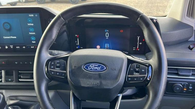 13" Touchscreen, 5G embedded modem, AECS NO SMS/Roll Detect 2G, PAS, Tyre pressure monitor, SYNC 4 - Android Auto/Apple Car Play, advance speech recognition, over the air update capability, Automatic headlights, Automatic windscreen wipers, Body coloured door mirrors, Body coloured front bumper, Body coloured rear bumpers, Daytime running lights, Electric front windows with one touch facility for driver and front passenger, Front mud flaps, Front splash guards, Low roof line, Quickclear front window defroster, Rear cargo hinged door, Rear splash guards, Trailer sway control, 6 Load compartment tie down loops, Courtesy light, Interior grab handle with driver's sunglasses holder, LED lights, Locking glove box lid, Sensico gearshift knob, 2 remote keys, Alcohol Interlock wiring preparation pack, Keyless entry and start, Locking wheel lug nut, Thatcham category 1 alarm, 20L AdBlue tank, ABS, Diesel particulate filter, ESP, Hill launch assist, Traction control, 16" Steel spare wheel, Full wheelcovers,