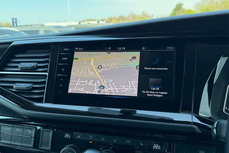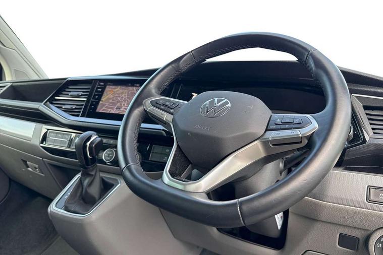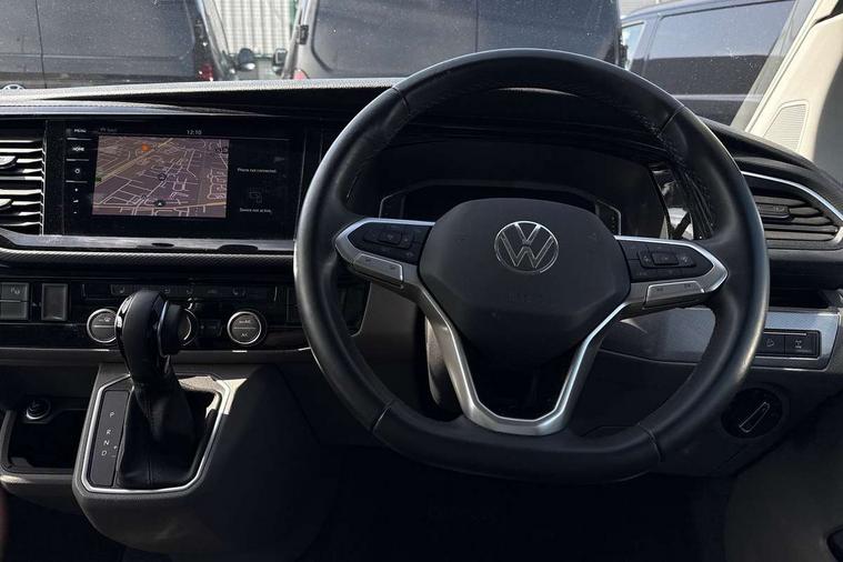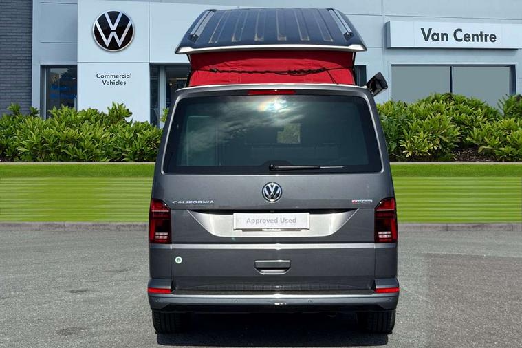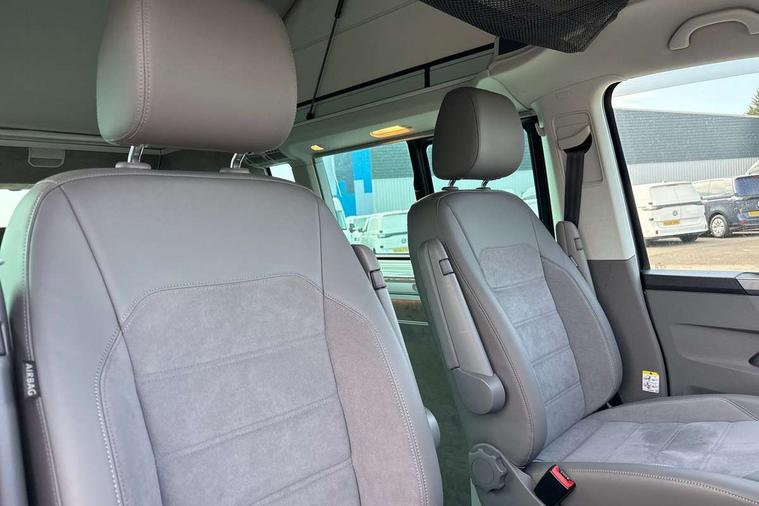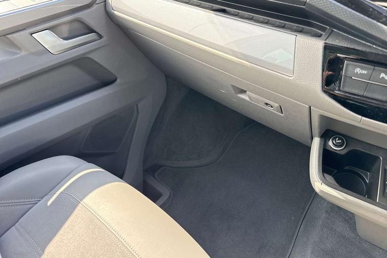 8" touch screen, Cross wind assist, Digital cockpit and driver alert system, eCall emergency system, Lane assist with side assist, Mobile phone interface, Navigation system preparation, Service interval indicator, Speed limiter, Start/stop system with regenerative braking, Tailgate latch without unlocking function from inside, Tailgate with window aperture and with power latching, Voice control system, Wired and wireless app connect, 17 inch chassis with 17 inch disc brakes in front and 16 inch disc brake in rear, 2 additional batteries with free maintanace including 1 additional battery with cut-off relay, 2 (type C) USB interfaces in dashboard, 8 speakers (4 tweeters + 4 woofers), Digital radio reception (DAB+), Regional code ECE for radio, Additional dust seals on the outside, Automatic headlight range control, Body colour bumpers, Body coloured door handles, California nameplate on the fender and on the rear, Electrically adjustable, heated, folding exterior mirrors, Electrohydrolic operated pop up roof with 3 windows and 1 front aperture, Front fog lights with cornering function, Heat insulating cab side windows, passenger compartment side windows tinted and with double glazing, Heated washer nozzles in front and washer fluid level indicator, High level 3rd brake light, LED headlamps with LED separate daytime running light, Left convex exterior mirror, Mounting rails on the roof (preparation for movable roof rack), Privacy glass with heat insulation, Radiator grille painted in black with 5 chrome trims, additional chrome trim at lower radiator grille, Rear boot, Rear window with insulating glass, rear window wiper and washer system, Right convex exterior mirror, Sliding window in front with fly screen and fixed window in rear in load passenger compartment left, Without left sliding door in load/passenger compartment, 1 waste bin in door storage compartment of the cab, 12V outlets in dashboard X 2, 2 velour floor mats, 2-seater bench/bed, movable along rail system and folds down into a two person bed, 230V inlet with charging feature for vehicle batteries and 230V outlet in the interior, 3 spoke leather wrapped multifunction steering wheel, Allergen filter, Armrest for both cab seats, Camping table for inside/outside in sliding door and 2 folding chairs in tailgate, Child seat anchors ISOFIX and top tether for Multivan/California in 2nd to 4th row of seats, Climatronic 3 zone air conditioning with 2nd evaporator, auxiliary heater, air conditioned headliner and additional passenger control, Dimmable illuminated instruments, Electromechanical speed sensitive power steering, height and longitudinally adjustable steering column, Front head restraints, Fully functional kitchen with gas hob, sink and 42 litre compressor cool box, Glove compartment with illumination, Grab handles on A pillar for access, on driver and front passenger side, Heated driver and front passenger seats, Illuminated steps in passenger/load compartment, Illuminated sun visors with mirror and airbag label on front passenger sun visor, Interior light concept for camper with comfort in passenger compartment incl additional LED light in the pop up roof for the loft bed, in the tailgate, Interior loading edge protection in plastic, Jack and tool kit, Manually adjustable lumbar supports for left and right single seat in the 1st row of seats, Operating voltage 12V including 230V outlet on driver seat, Plastic floor covering in passenger/load compartment, Programmable parking heater with radio remote control and auxiliary heater, Rear head restraints, Refrigerant R1234yf, Roof bed (2000 x 1200 mm) with spring plates and mattress, Soft folding grab handles on roof frame, Special interior noise suppression measures, Special sound deadening measures in cab and passenger compartment, Step illumination with California lettering, Swivel seat on the left, with lumbar support in 1st row of seats, Swivel seat on the right, with lumbar support in 1st row of seats, Waeco compressor fridge, Without height adjustment for driver and single passenger seats, Lights and vision pack - California Ocean, Smokers pack - California, Airbags - Drivers and front passengers side and curtain airbags, Driver/Front Passenger airbags, Electronic stability control, ABS, ASR, EDL, brake assist system, Front assist with Autonomous emergency braking for Adaptive cruise control (ACC), Height adjustable 3 point seat belts on outer seats in cab with electric pretensioners, Hill start assist, Manual passenger airbag deactivation function, Power operated child safety locks, Single tone horn, Warning buzzer and light for driver seat belt not fastened, Anti theft alarm system with interior monitoring in cab, backup horn and towing protection, Central locking system with radio remote control, system controls inside and safelock, Lockable wheel bolts, Comfort dashboard lower part in palladium with chrome elements and bezels painted in black,