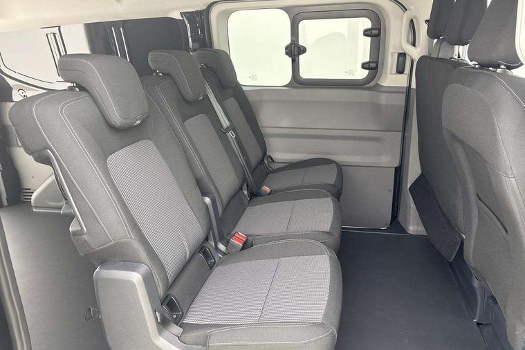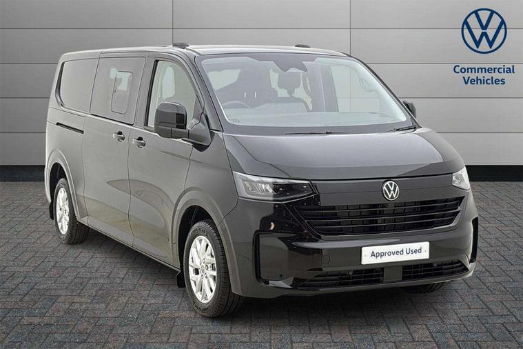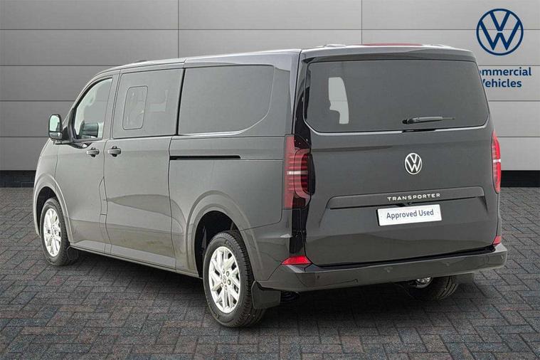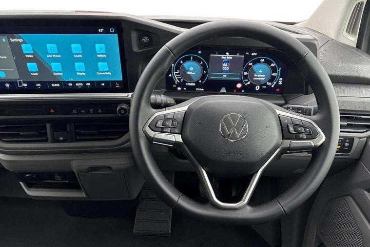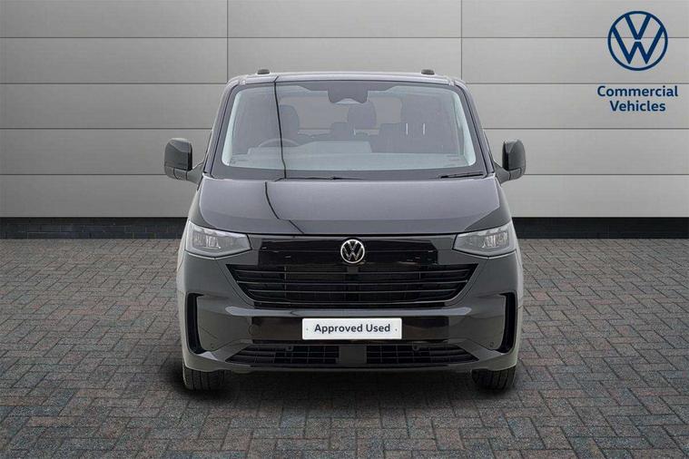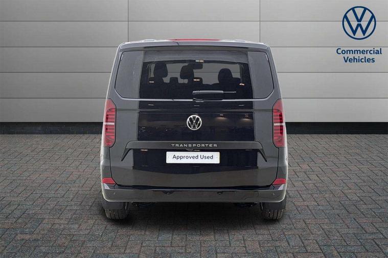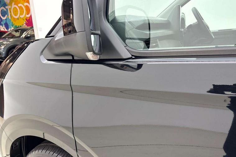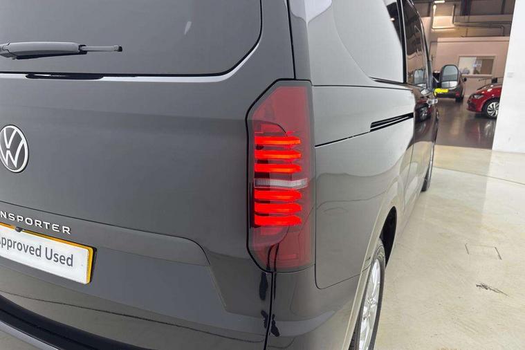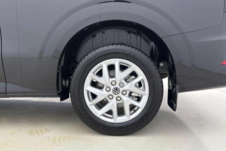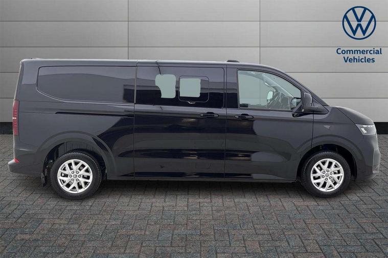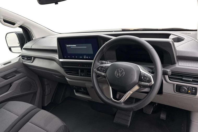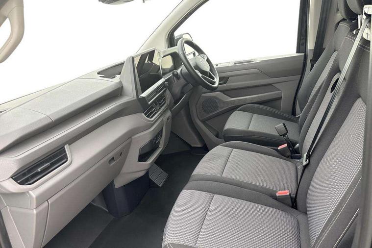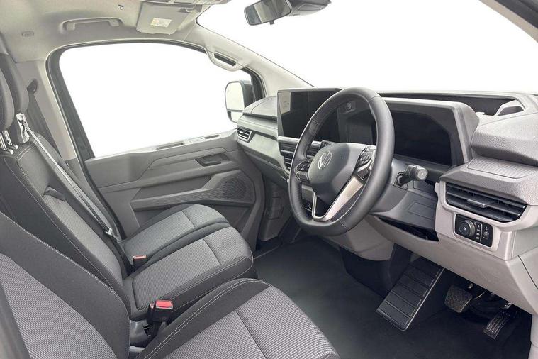 12" digital drivers display, 13" touchscreen infotainment display with wireless app connect and DAB radio, 5G Modem, Adaptive cruise control with predictive speed limiter and traffic jam assist, Dynamic road sign display, eCall emergency system, Front collision warning with braking, Identification label for N1 commercial vehicle registration, Lane assist with blind spot assist and exit warning system, PAS, Preparation of VW connect and connect plus, Wireless mobile phone charging, Wrong way driver warning, 6 speakers, Body colour bumpers front and rear, Body coloured add on parts, Body coloured door handles, Body coloured door mirrors, Body coloured radiator grille, Dual sliding doors with pop-out window vents (left and right) for 2nd row, Electrically heated, adjustable and folding door mirrors, Heat reflecting glass in front side windows, privacy glass in rear side windows and rear window, Heated rear window, Laminated windshield made of heat-reflecting glass, Mud flaps front and rear, Rear tailgate, Rear Transporter nameplate in black grained decorative trim, Rear window wiper with washer system, Sliding doors on driver and front passenger side, Vehicle opening configuration 1x 1st row of seats, 2x all doors, 12 pin terminal block, 12V outlet in centre console and 12V outlet on rear right D-pillar, 2 LED lights in roof of load compartment, 3 single seats in 2nd row, folding and tumbling, 2x isofix and top tether, 3x additional super bright LED lights in load compartment, 4 way height and tilt adjustable head restraints, 6 tie downs for securing goods in the passenger/load compartment, 7x USB in cab and 2x USB in passenger compartment, Black plastic scuff plate for sliding door in cargo, illuminated, Black plastic scuff plate in front without illumination, Covers in the bottom area of all side panels and doors in the load compartment, Dimming breakaway interior rear view mirror, Gear selector lever on steering wheel, Grab handle on A-pillar passenger side, Illuminated glove compartment with lockable lid, LED light units for cab and passenger compartment, Overhead storage compartment, Single driver and single passenger seat in cab, Striped fabric upholstery, Without bulkhead, Without floor covering in load compartment, Driver and front passenger airbag with front passenger airbag deactivation, Dual tone horn, Seat belt pretensioner for front seats, Side and curtain airbags in cab curtain airbags in passenger compartment, Anti theft alarm system with interior monitoring in cab, backup horn and towing protection, Anti-theft wheel bolts, Central locking, Preparation for alcohol ignition interlock, 5+ Promise, Alternator - 230A, Electromechanical brake booster, Electronic Stability Control (ESC),