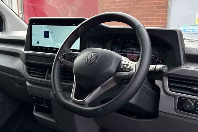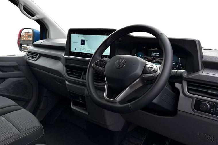 12" digital drivers display, 13" touchscreen infotainment display with wireless app connect and DAB radio, 5G Modem, Adaptive cruise control, Apple CarPlay and Android Auto, Driver alert system, Driver alert system and driver attention monitor, Dynamic road sign display, eCall emergency system, Electromechanical speed sensitive power steering, height and longitudinally adjustable steering column, Front and rear view camera and two side cameras, Lane and blind spot assist with exit warning system, Preparation of VW connect and connect plus, Traffic jam assist, Wireless mobile phone charging, Wrong way driver warning, Body colour bumpers, Body coloured door handles, Body coloured door mirrors, Body coloured radiator grille, Electrically heated, adjustable and folding door mirrors, Heat reflecting side window glass, Mud flaps front and rear, Rear Transporter nameplate in black grained decorative trim, Vehicle opening configuration 1x 1st row of seats, 2x all doors, 12V outlet in centre console and 12V outlet on rear right D-pillar, 2x 15-W USB data/charging ports in dashboard and 1x USB-C, 1x USB-A center bottom, 2x LED lights in load compartment, 3x additional super bright LED lights in load compartment, 4 way height and tilt adjustable head restraints, 5 additional USB-C charging ports, Black plastic scuff plate for sliding door in cargo without illumination, Cabin interior lighting, Gear selector lever on steering wheel, Glasses compartment in driver side roof, Grab handle on A-pillar passenger side, Illuminated lockable glovebox, Lashing rings for reinforced floor covering, Narrow centre console with cup holder and compartment for mobile phone, Overhead storage compartment, Rubber floor covering in cab, Striped fabric upholstery, Without passenger seats in load compartment, Driver and front passenger airbag with front passenger airbag deactivation, Front and curtain airbags for driver and front passenger, Seat belt pretensioner for driver seat, Single tone horn, Anti theft alarm system with interior monitoring in cab, backup horn and towing protection, Electronic immobiliser, Keyless access with safelock, Lockable wheel bolts, Preparation for alcohol ignition interlock, 5+ Promise, Alternator - 230A, Electromechanical brake booster, Electronic stability control, ABS, ASR with deactivation button, hill start assist and brake assist system,