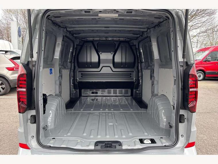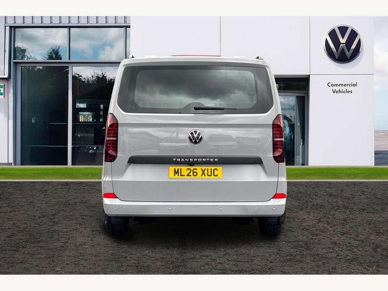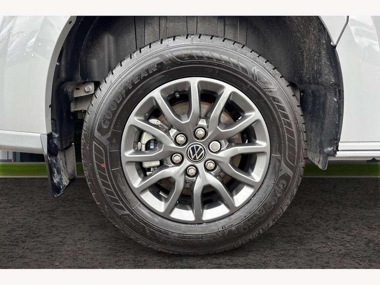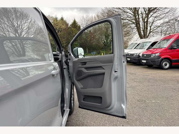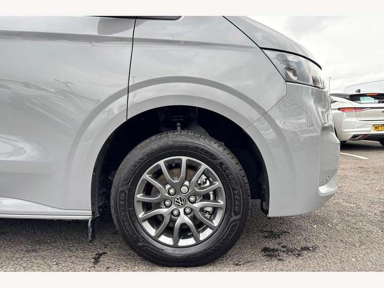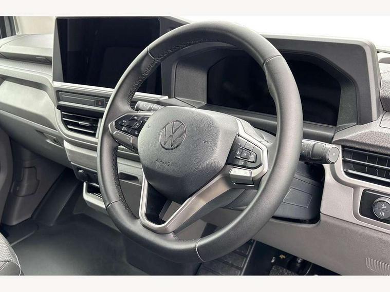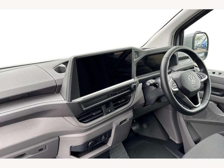 12" digital drivers display, 13" touchscreen infotainment display with wireless app connect and DAB radio, 5G Modem, Apple CarPlay and Android Auto, Cruise control, Driver alert system, Driver alert system and driver attention monitor, Dynamic road sign display, eCall emergency system, Electromechanical speed sensitive power steering, height and longitudinally adjustable steering column, Lane assist, Preparation of VW connect and connect plus, Wrong way driver warning, 4 speakers - 2x dashboard, 2x cab doors, Body coloured door handles, Heat reflecting side window glass, Mud flaps front and rear, Rear Transporter nameplate in black grained decorative trim, Vehicle opening configuration 1x 1st row of seats, 2x all doors, 2x 15-W USB data/charging ports in dashboard and 1x USB-C, 1x USB-A center bottom, 2x LED lights in load compartment, 3 spoke leather wrapped multi function steering wheel, 4 way height and tilt adjustable head restraints, Black plastic scuff plate for sliding door in cargo without illumination, Cabin interior lighting, Gear selector lever on steering wheel, Grab handle on A-pillar passenger side, Lashing rings for reinforced floor covering, Narrow centre console with cup holder and compartment for mobile phone, Overhead storage compartment, Roof grab handle on front passenger side, Rubber floor covering in cab, Striped fabric upholstery, Without passenger seats in load compartment, Parking package plus - Transporter, Driver and front passenger airbag with front passenger airbag deactivation, Front and curtain airbags for driver and front passenger, Seat belt pretensioner for driver seat, Single tone horn, Anti theft alarm system with interior monitoring in cab, backup horn and towing protection, Electronic immobiliser, Preparation for alcohol ignition interlock, 5+ Promise, Alternator - 230A, Electronic stability control, ABS, ASR with deactivation button, hill start assist and brake assist system,