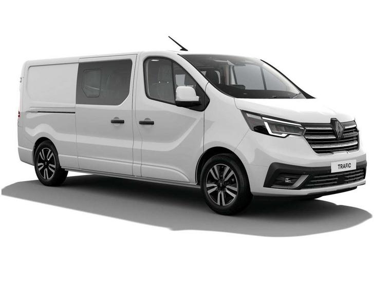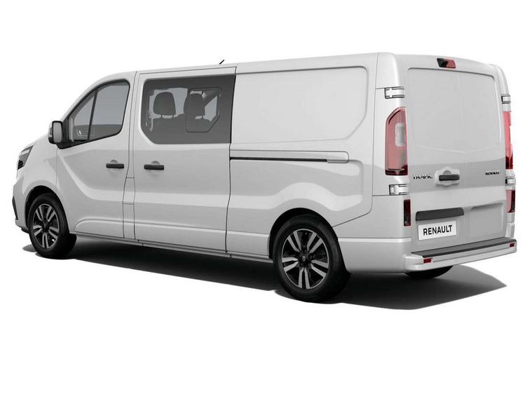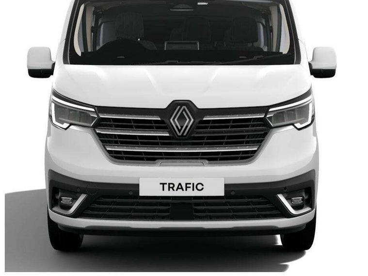 360 degree parking sensors (front, rear and lateral ultra sonic sensors), 7" Colour TFT driver information display, Driver attention alert, Driver drowsiness warning, E-Call - automated emergency call, Easy link navigation with 8" touchscreen DAB radio with bluetooth, USB + aux input, compatible with Apple CarPlay and Android Auto, ECO mode button, Gearshift indicator, Intelligent Speed Assist, Lane departure warning system, PAS, Trip computer, Wireless smart phone integration with Android auto & Apple CarPlay, Automatic high beam, Blind spot mirror on passenger sunvisor, Body coloured door mirrors, Body coloured front bumper, Body coloured side mouldings, Chrome Grille, Electric folding door mirrors, Electric front windows with one touch drivers window, Front fog lights, Full LED headlights with C-shaped DRL, New brand identity, Roof bar fixings, Side loading door - L and R glazed with opening window, Wide view mirror, 12V power socket in front, 2nd row of 3 passenger seats Individual seats with adjustable headrests, ISOFIX (left & right seat), 2 armrests, Climate control, Closed glovebox, Glazed full bulkhead, Height adjustable drivers seat with armrest and lumbar adjustment, Interior LED cabin lighting, Interior side panels - load area, Interior side panels up to windows, Java cloth upholstery, LED load space lighting, Premium dashboard with horizontal grain and chrome styling, Premium faux leather steering wheel, Look pack - Trafic, Parking pack - Trafic, Visibility pack - Trafic, 3 point height adjustable seatbelts with pretensioners and load limiter, Driver and passenger airbags, Driver and passenger seatbelt reminder, Front lateral and curtain airbags and passenger airbag with deactivation, Alarm - Thatcham T1 volumetric alarm, Alcohol interlock pre-device, Deadlocking, Electronic immobiliser, Hands free key card with push button stop/start function, Keyless entry system, Remote central locking, 20L AdBlue tank, 4 disc brakes, 6 speed gearbox, 80 litre fuel tank, ABS with EBD (Electronic Brake force Distribution), Active emergency braking system, ESC (Electronic Stability Control) with Hill Start Assist and Grip Xtend, 17" Avens diamond cut alloy wheels,