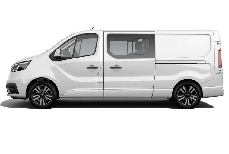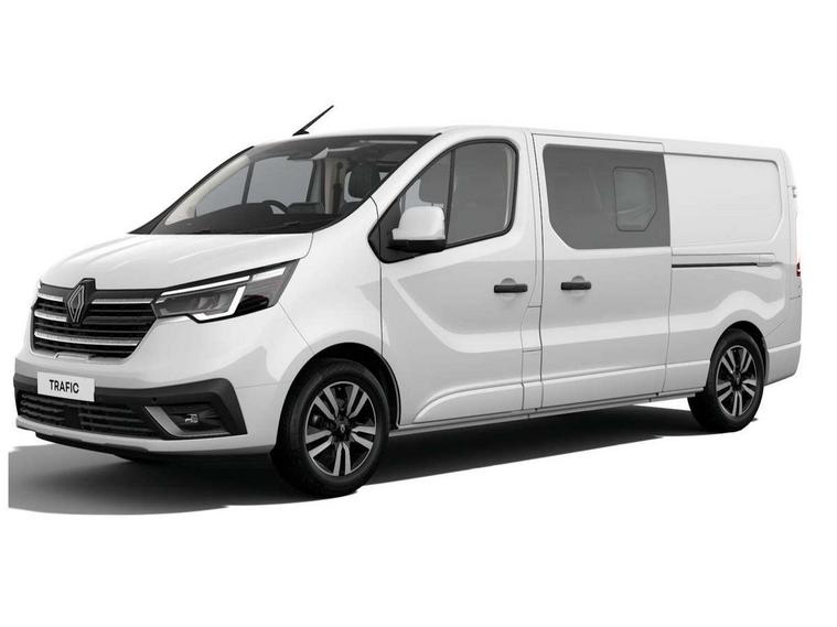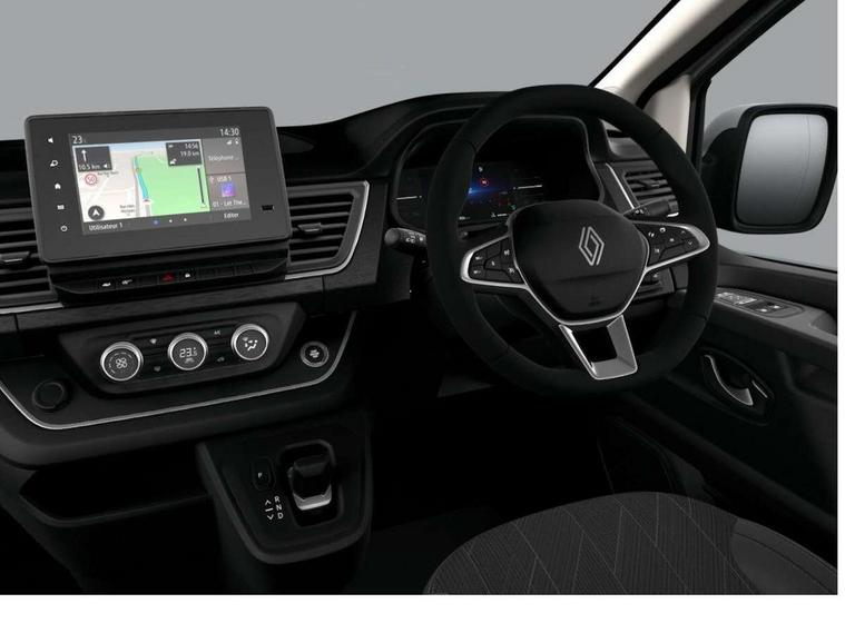 360 degree parking sensors (front, rear and lateral ultra sonic sensors), 7" Colour TFT driver information display, Driver attention alert, Driver drowsiness warning, E-Call - automated emergency call, Easy link navigation with 8" touchscreen DAB radio with bluetooth, USB + aux input, compatible with Apple CarPlay and Android Auto, ECO mode button, Gearshift indicator, Intelligent Speed Assist, Lane departure warning system, PAS, Trip computer, Wireless smart phone integration with Android auto & Apple CarPlay, Automatic high beam, Blind spot mirror on passenger sunvisor, Body coloured door mirrors, Body coloured front bumper, Body coloured side mouldings, Chrome Grille, Electric folding door mirrors, Electric front windows with one touch drivers window, Front fog lights, Full LED headlights with C-shaped DRL, New brand identity, Roof bar fixings, Side loading door - L and R glazed with opening window, Wide view mirror, 12V power socket in front, 2nd row of 3 passenger seats Individual seats with adjustable headrests, ISOFIX (left & right seat), 2 armrests, Climate control, Closed glovebox, Glazed full bulkhead, Height adjustable drivers seat with armrest and lumbar adjustment, Interior LED cabin lighting, Interior side panels - load area, Interior side panels up to windows, Java cloth upholstery, LED load space lighting, Premium dashboard with horizontal grain and chrome styling, Premium faux leather steering wheel, Look pack - Trafic, Parking pack - Trafic, Visibility pack - Trafic, 3 point height adjustable seatbelts with pretensioners and load limiter, Driver and passenger airbags, Driver and passenger seatbelt reminder, Front lateral and curtain airbags and passenger airbag with deactivation, Alarm - Thatcham T1 volumetric alarm, Alcohol interlock pre-device, Deadlocking, Electronic immobiliser, Hands free key card with push button stop/start function, Keyless entry system, Remote central locking, 20L AdBlue tank, 4 disc brakes, 6 speed gearbox, 80 litre fuel tank, ABS with EBD (Electronic Brake force Distribution), Active emergency braking system, ESC (Electronic Stability Control) with Hill Start Assist and Grip Xtend, 17" Avens diamond cut alloy wheels,
