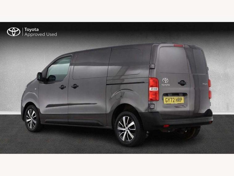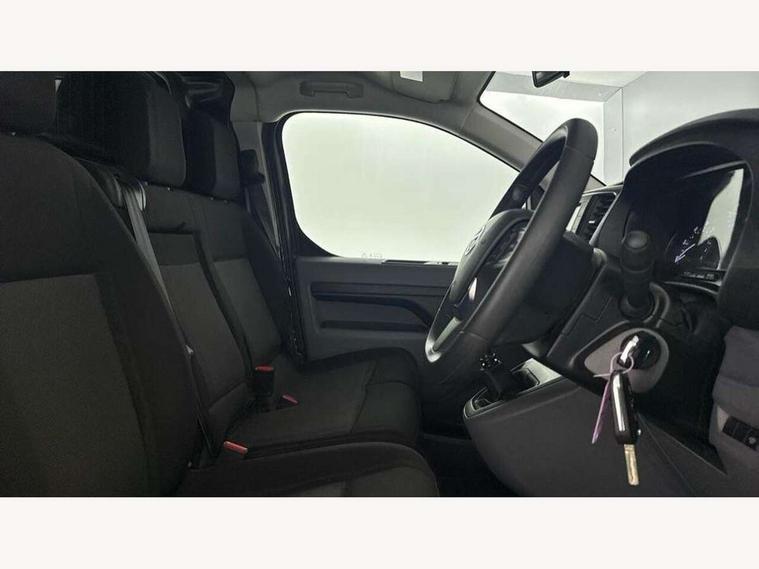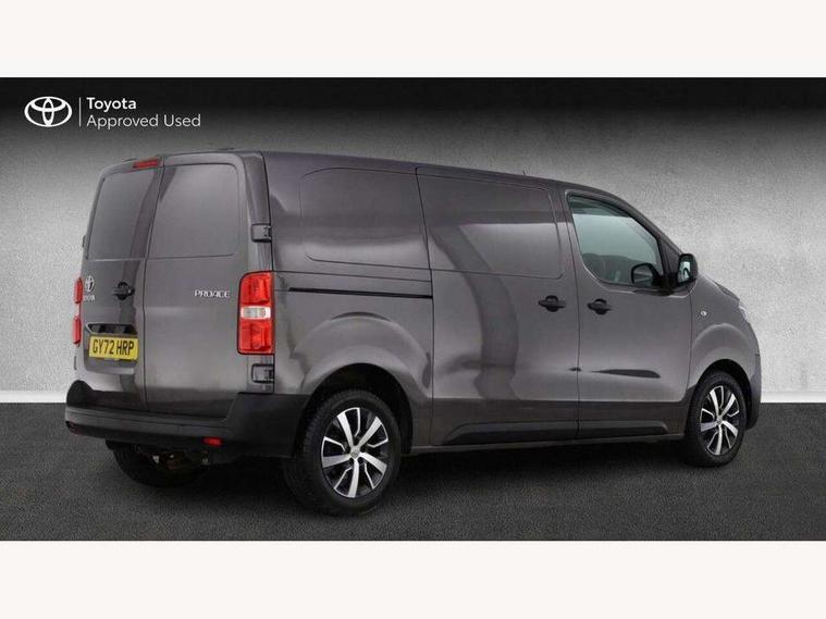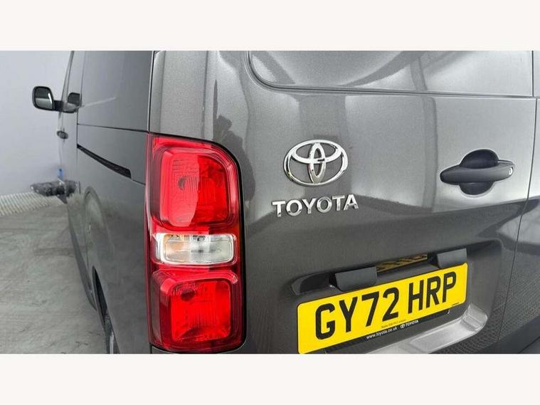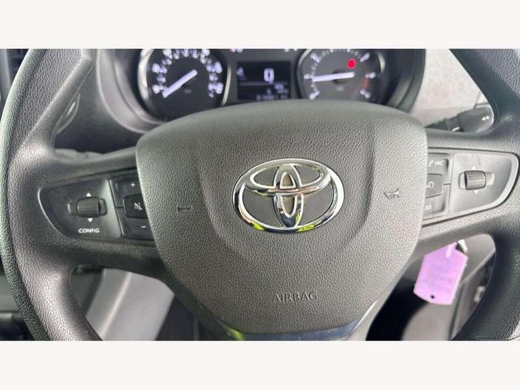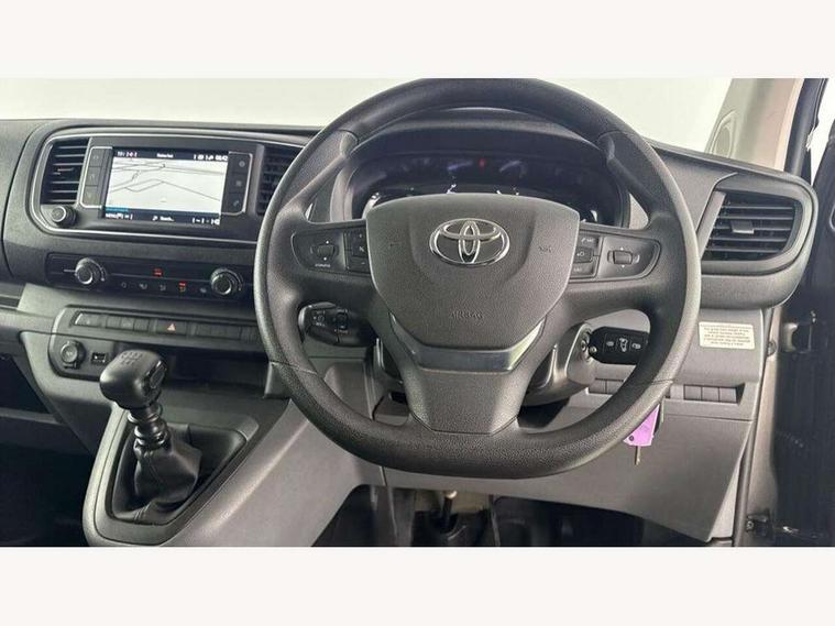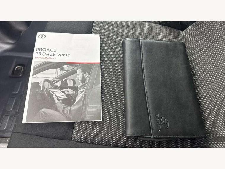 Bluetooth handsfree connectivity, Cruise control, PAS, Tyre pressure warning system (TPWS), 4 speakers, Digital radio (DAB), Radio/CD player, USB connector, 180 degree opening rear doors, Acoustic windscreen, Auto Headlights, Auto wipers, Black bumpers, Black door handles, Black protection moulding on side door, Body Coloured roof, Daytime running lights, Front power windows, Headlight cut-off reminder, Heated door mirrors, LED High mounted stop light, Manually adjustable day/night rear view mirror, Multi reflector halogen headlights, Panel rear wing doors, Power adjustable door mirrors, Rear combination lights, Short Antenna, Smoke tinted (30%) privacy glass on rear passenger window, Two manual sliding side doors, 2 seat front passenger bench, Driver seat armrest, Fabric seats, Front cup holders, Front room lights, Glovebox light, LED Driver and front passenger personal lights, Lighted and chilled upper glove box, Manually reclining and sliding driver and front passenger seats, Open upper dashboard storage compartment, Panel bulkhead with window and protective grille, Storage under passenger bench, Air conditioning and Smart cargo pack - Proace, Parking pack - Proace, Double front passenger airbag, Front passenger airbag on/off switch, Supplement restraint system (SRS) 2 airbags, Alarm, Deadlocks + 2 remote keys, Power door locks, 12V power front outlet, 12v socket in dashboard and rear, Adjustable speed limiter (ASL), Anti lock braking system (ABS), Brake Assist (BA), Stop/start function, Toyota traction select, Vehicle stability control (VSC) and hill start assist control (HAC), Full size spare wheel, Full wheel covers,