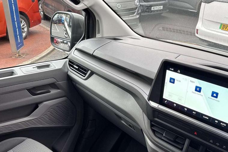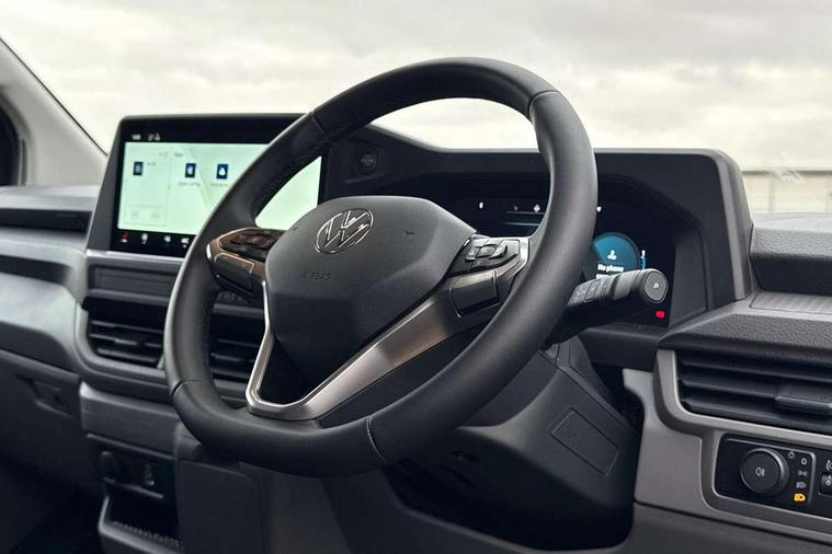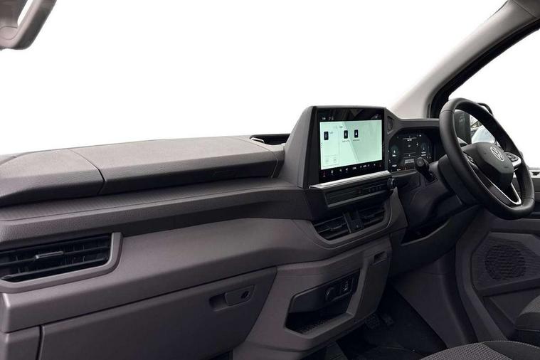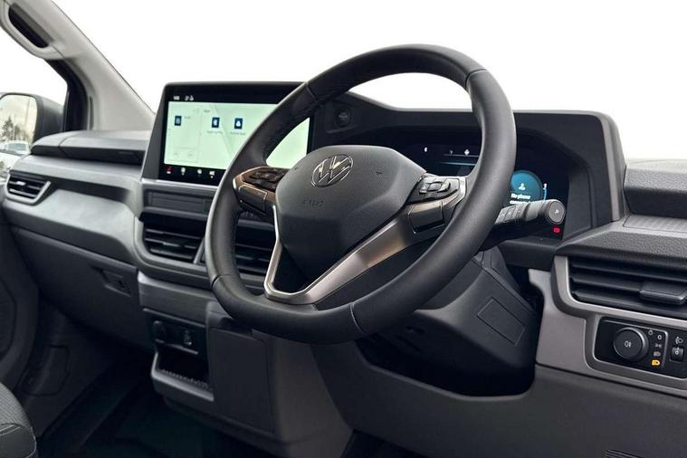 12" digital drivers display, 13" touchscreen infotainment display with wireless app connect and DAB radio, 5G Modem, Adaptive cruise control, Apple CarPlay and Android Auto, Driver alert system, Driver alert system and driver attention monitor, Dynamic road sign display, eCall emergency system, Electromechanical speed sensitive power steering, height and longitudinally adjustable steering column, Front and rear view camera and two side cameras, Lane and blind spot assist with exit warning system, Preparation of VW connect and connect plus, Traffic jam assist, Wireless mobile phone charging, Wrong way driver warning, Body colour bumpers, Body coloured door handles, Body coloured door mirrors, Body coloured radiator grille, Electrically heated, adjustable and folding door mirrors, Heat reflecting side window glass, Mud flaps front and rear, Rear Transporter nameplate in black grained decorative trim, Vehicle opening configuration 1x 1st row of seats, 2x all doors, 12V outlet in centre console and 12V outlet on rear right D-pillar, 2x 15-W USB data/charging ports in dashboard and 1x USB-C, 1x USB-A center bottom, 2x LED lights in load compartment, 3x additional super bright LED lights in load compartment, 4 way height and tilt adjustable head restraints, 5 additional USB-C charging ports, Black plastic scuff plate for sliding door in cargo without illumination, Cabin interior lighting, Gear selector lever on steering wheel, Glasses compartment in driver side roof, Grab handle on A-pillar passenger side, Illuminated lockable glovebox, Lashing rings for reinforced floor covering, Narrow centre console with cup holder and compartment for mobile phone, Overhead storage compartment, Rubber floor covering in cab, Striped fabric upholstery, Without passenger seats in load compartment, Driver and front passenger airbag with front passenger airbag deactivation, Front and curtain airbags for driver and front passenger, Seat belt pretensioner for driver seat, Single tone horn, Anti theft alarm system with interior monitoring in cab, backup horn and towing protection, Electronic immobiliser, Keyless access with safelock, Lockable wheel bolts, Preparation for alcohol ignition interlock, 5+ Promise, Alternator - 230A, Electromechanical brake booster, Electronic stability control, ABS, ASR with deactivation button, hill start assist and brake assist system,