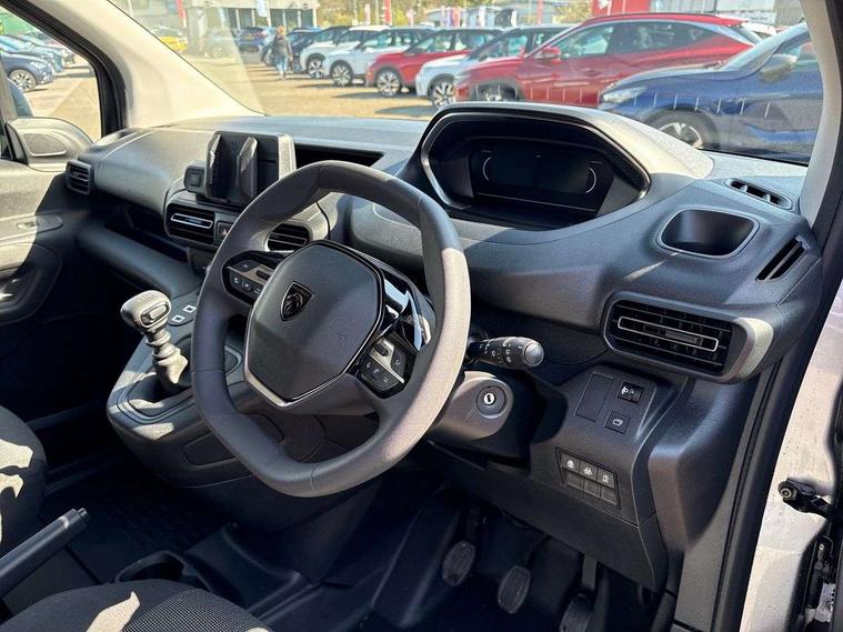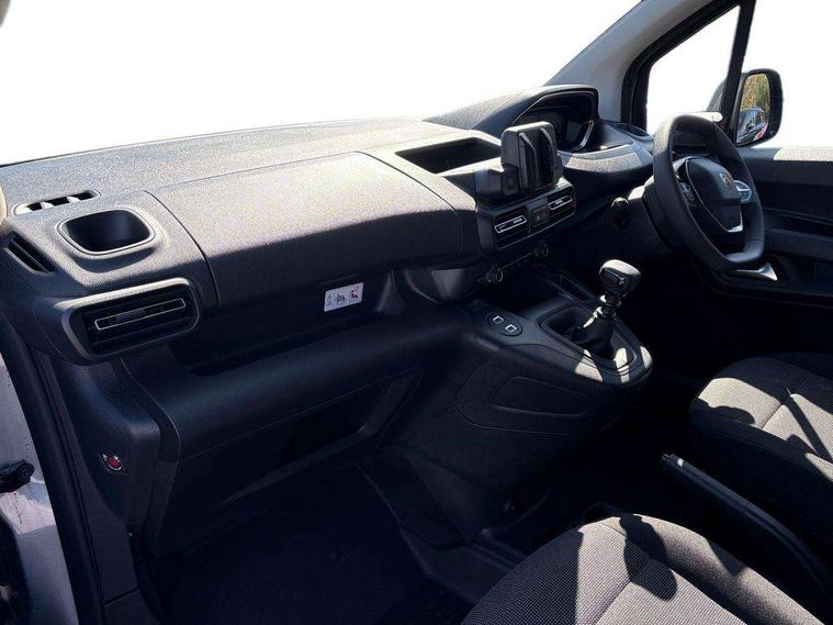 10" digital instrumental cluster, Bluetooth, Connected services, Cruise control and speed limiter, Driver attention alert, Intelligent Speed Assist, Lane keeping assist, PAS, Peugeot connect with RCE (emergency call and localization assistance + offers of branded services), Rear parking sensor, TPMS (Tyre pressure monitoring system), AM/FM/DAB digital radio, Audio controls mounted on steering wheel, Peugeot i-Connect - TomTom 3D navi, 10"HD central screen, WiFi mirroring, steering wheel controls, OK peugeot, 2x speakers, 2x tweeters, 2xUSB, Short antenna (200mm), 2 sliding doors without window, Automatic headlamps on/off, Automatic lighting control, Black door handles, Black exterior mirrors, Black front and rear bumpers, Black side moulding, Eco LED headlamps with integrated daytime running lights, Electric front windows with one touch operation, Electrically adjustable + heated door mirrors, High beam assist, Sliding door rail cover with short black trim, 4-way passenger seat (reach/rake) with adjustable headrest, 6-way adjustable driver's seat with reach, rake, height and lumbar adjustment, Air recirculation facility, Black interior air vents, Black interior door handles, Curitiba cloth upholstery, Driver seat armrest, Driver's top lidded glovebox, Fixed floor mounted load restraint lashing eyes x6, Full bulkhead with load-through hatch, Hard plastic floor protection in cabin, Luggage floor trim, Manual air conditioning, Overhead storage shelf with roof light and handle, Reach and rake adjustable steering column, Sport steering wheel, Storage/trays on back of passenger seat, Three seats second row bench with rear lap and diagonal inertia reel seatbelts, Two position moveable ladder frame bulkhead, Vinyl load floor covering, 2x3 point seatbelts in 1st row and 3x3 point seatbelts in 2nd row, Acoustic vehicle alerting system, Automatic activation of hazard warning lights on major deceleration, Driver's airbag, Front passenger airbag, Height adjustable front seatbelts, Row-1 curtain airbag, Row-1 side airbag, Row-1 side thorax airbag, Dashboard mounted central locking push button and auto locking above 7mph, Immobiliser, Primary + spare folding keys, Remote control central locking and deadlocking, 12v socket in dashboard, Advanced emergency braking system (AEBS), Electronic parking brake, Electronic Stability Control and ABS with hill start assist, EBA and EBFD, Traction control, 16" Grey steel wheels with half hubcap,