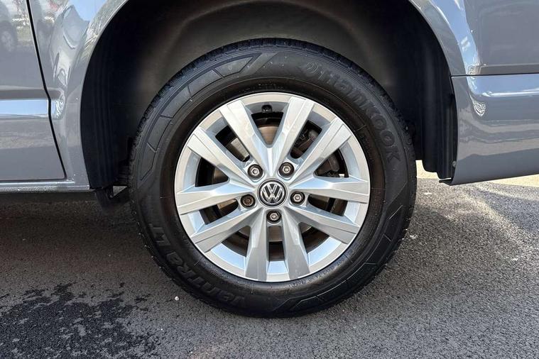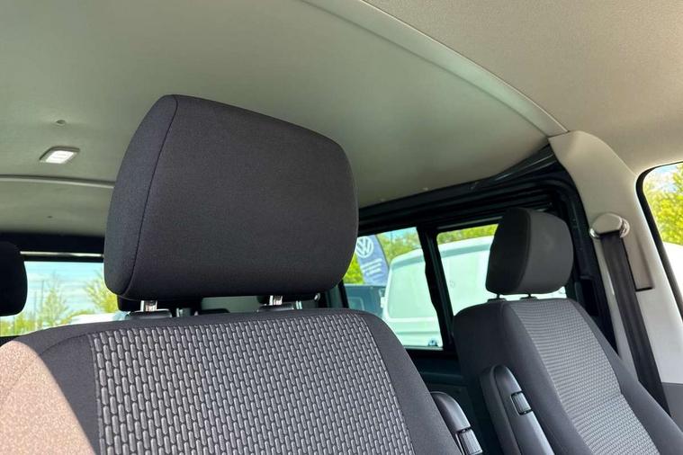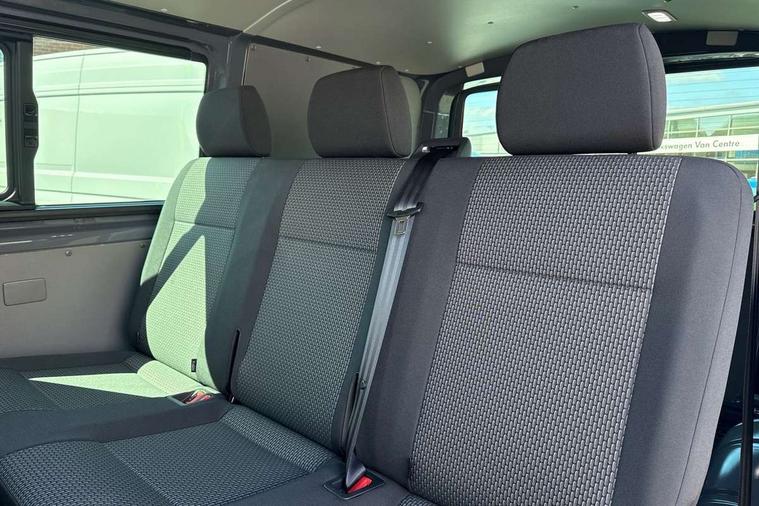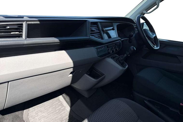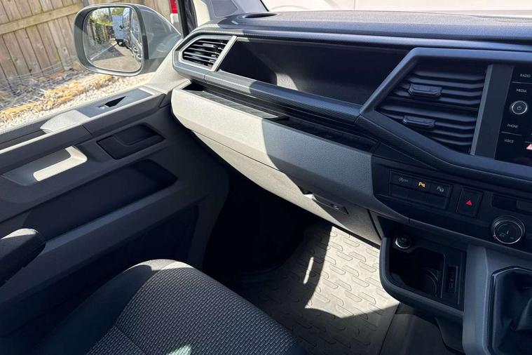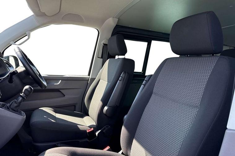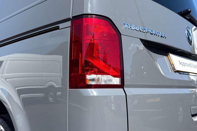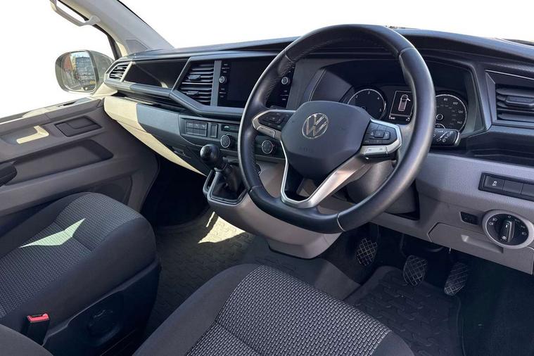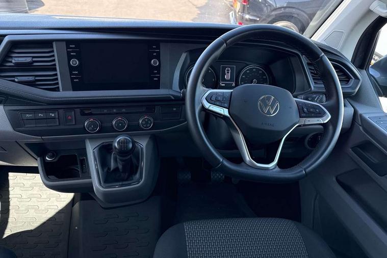 Adaptive cruise control, Child seat anchors ISOFIX and top tether in 2nd row of seats, Cross wind assist, Dimmable illuminated instruments, Driver alert with black and white multi function display plus, eCall emergency system, Forward collision warning front assist with autonomous emergency braking, Headlight range control, Mobile phone interface, Without voice control, 2 USB interfaces type C in dashboard, 4 speakers with 2 tweeters and 2 woofers, Composition colour radio with 6.5" touchscreen, Digital radio reception (DAB+), Volkswagen app connect, Automatic headlight control, leaving home and manual coming home feature, Front fog lamps with cornering light, Green heat insulating glass, Heated front windscreen, Illuminated steps in passenger/load compartment, Left convex exterior mirror, Power folding adjustable door mirrors with separately heated, Privacy glass from the B-pillar and heat-insulating glass in front, Radiator grille with 2 chrome trims, Rear window with heated insulating glass, heated rear window wiper and washer system, Right convex exterior mirror, Tailgate closing with unlatching from the inside, Transporter nameplate on the rear fender, Windshield wiper intermittent control with rain sensor for windshield wipers, Without adhesive film, 3 spoke leather wrapped multi function steering wheel, Additional sound deadening measures in cab and passenger compartment, Auto dimming breakaway interior rear view mirror, Comfort headliner in cab, hardboard roof trim in passenger and load compartment, Dust/pollen filter, Folding grab handles and storage compartments on cab seats, reading light, Front seats on the right in 1st row of seat, Glove compartment with illumination, Heavy duty tool kit and jack, Interior plastic loading edge protection, Lashing rings for load restraint system, LED Interior lighting in load and passenger compartment, Manual height adjustable and lumbar support for driver and single passenger seats, Medium height for vehicles with window aperture hardboard side trim panels in passenger/load compartment, Refrigerant R134a, Standard lower part dashboard in palladium, Without partition, Without seats in 3rd row of seats, Comfort pack - Transporter, Exterior pack without fog light- Transporter, Light and vision pack - Transporter, Non smoker pack - Transporter, 3 point height adjustable seat belts on outer seats cab with electric pretensioners, Driver and front passenger airbag with front passenger airbag deactivation, Power operated child safety lock, Warning buzzer and light for driver seat belt not fastened, Anti theft alarm system with interior monitoring in cab, backup horn and towing protection, Lockable wheel bolts, 16" chassis with 16" brake system, Additional 12V socket, Diesel particulate filter, Electronic stability control, ABS, ASR with deactivation button, hill start assist and brake assist system, Speed limiter, Start/stop system with regenerative breaking, 16" Clayton alloy wheels, Wheel trims,