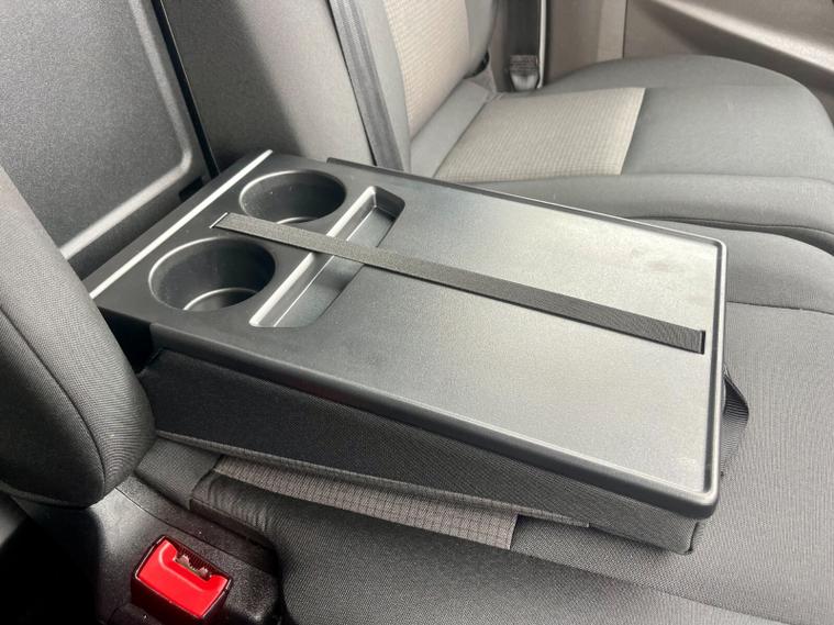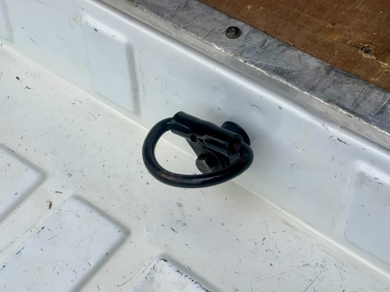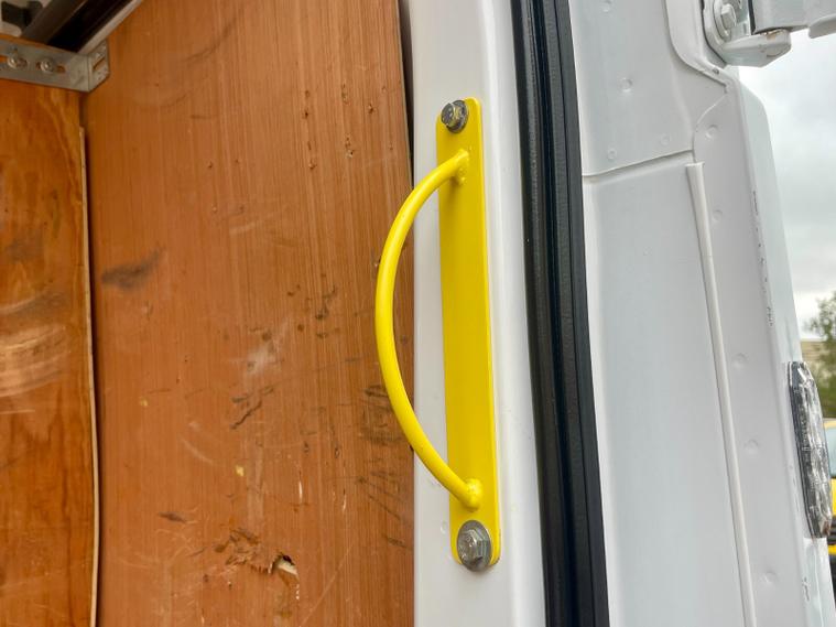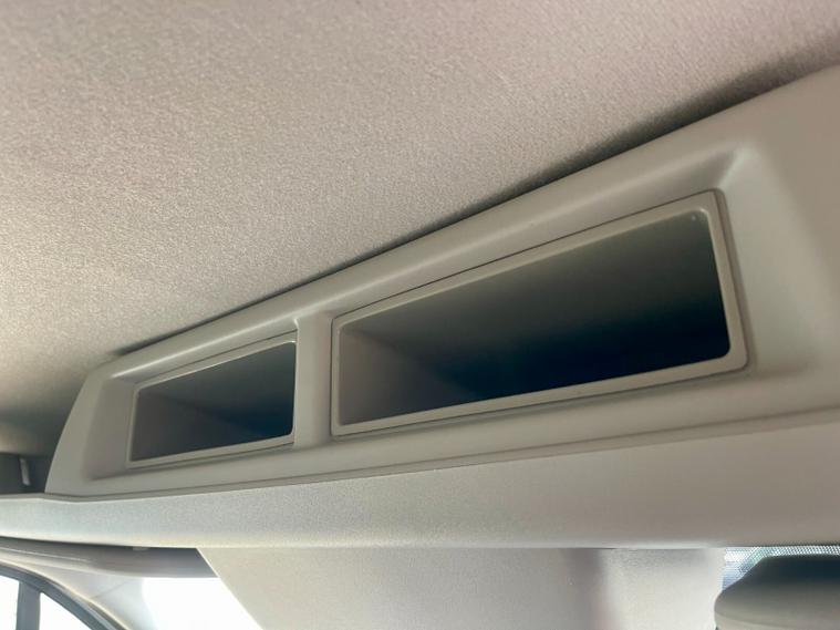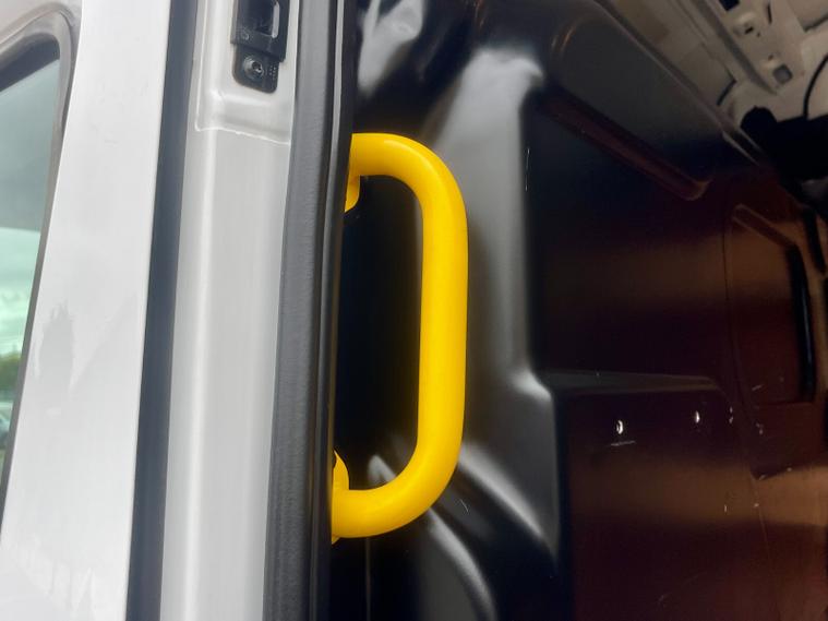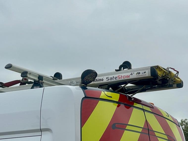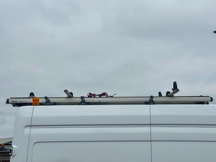 The exterior, finished in Frozen White, is enhanced with professional equipment including a RHINO Roof Rack and RHINO SafeStow 4 ladder system, offering convenient and secure storage solutions for tools or materials.