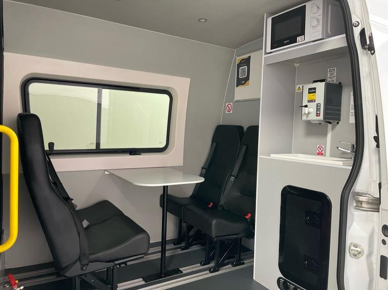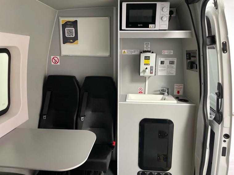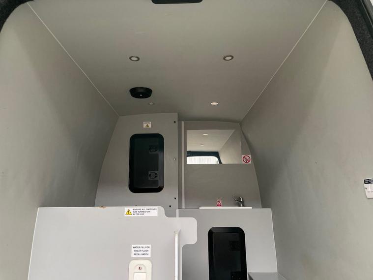 This Sprinter is configured as a welfare van, providing ample interior space for crew, equipment, or supplies needed for community support or mobile operations. It is equipped with facilities for workers in remote locations, providing a portable office, break area, and restrooms, to ensure worker comfort, safety, and compliance with regulations where permanent facilities are unavailable.