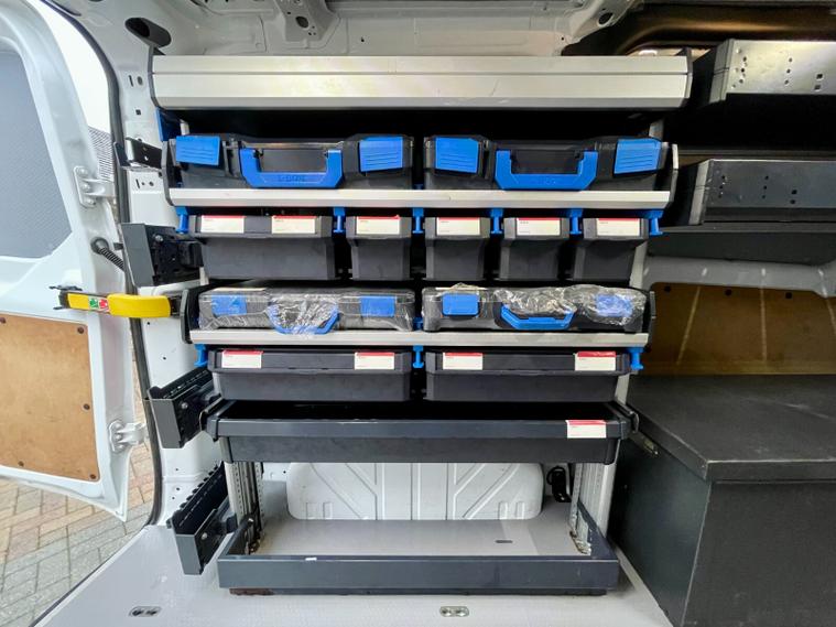 Inside, the cabin features air conditioning, Bluetooth connectivity, DAB radio, electric windows, and power assisted steering (PAS) for everyday comfort. The load area is set up for work with a bulkhead, lined rear, and internal racking, making it particularly suitable for organised tool and equipment storage.