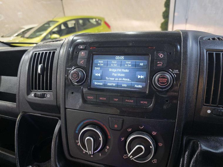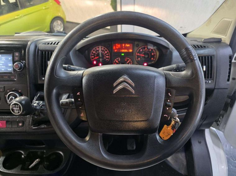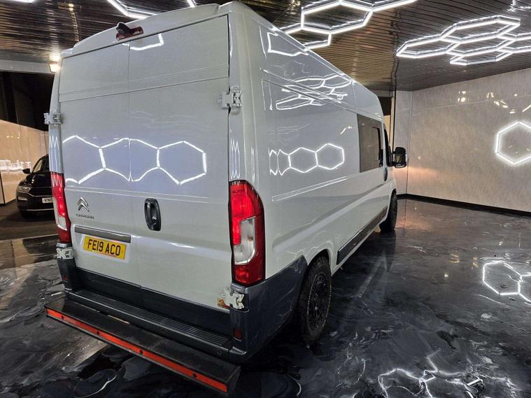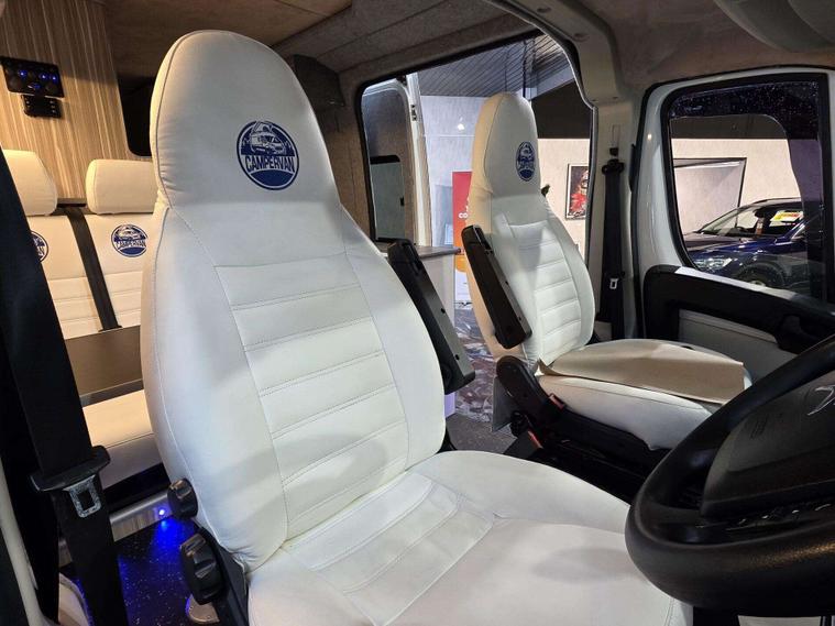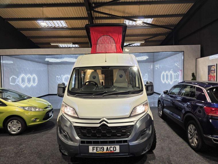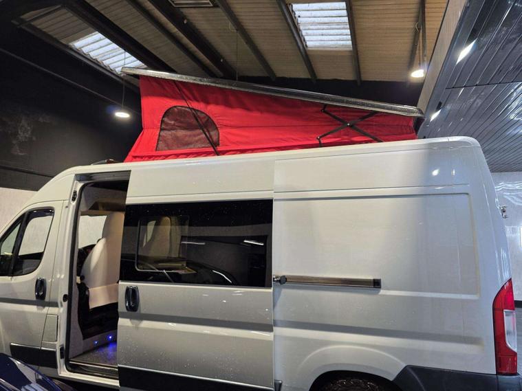 The living space includes a pop-top roof with red canvas scenic route tent, fully unzipable with windows, LED lighting and a double mattress, plus a fold-down double bed below with TV/DVD player. There’s also a shower, sink and toilet cubicle, white vinyl leather seats embroidered with Citroën Relay Campervan branding, touch LED dimmer spotlights throughout, a removable breakfast table, and 90L fresh water tank with 60L waste tank.