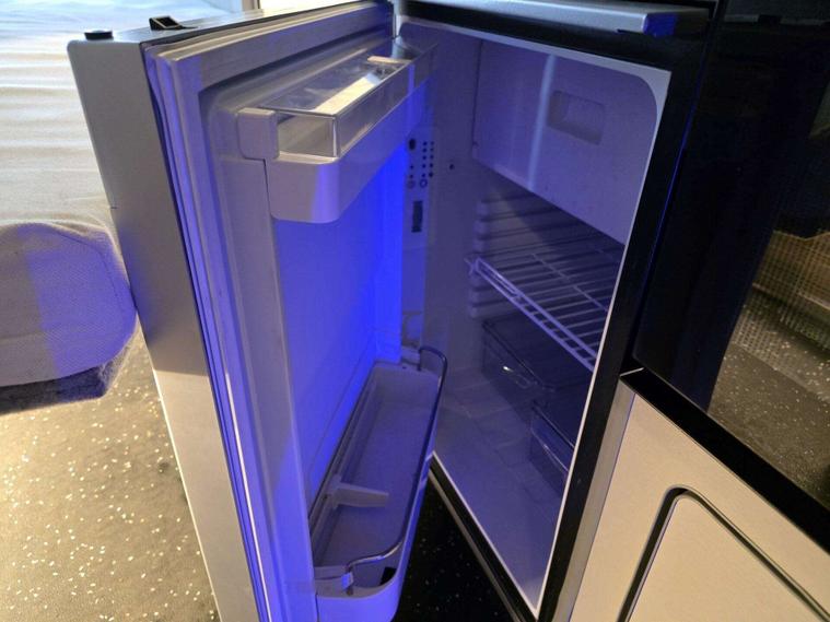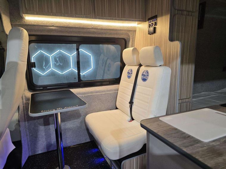 Inside is where this camper really shines, offering a high-spec conversion with everything you need for comfortable trips away. The kitchen features a Triplex 700 series cooker with oven and grill, QN80 fridge freezer, full-size worktop, cutlery drawer and extensive storage for all your kitchen essentials. Power is well covered with 240V plug sockets front and rear, 12V sockets, USB ports and external 240V hookup, along with portable solar panel connections for off-grid adventures.