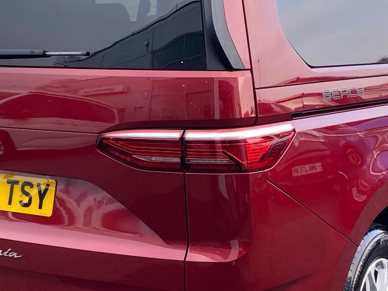 California Beach camper 150ps 2.0tdi DSG in metallic fortana red with deep black pearlescent roof with 7626 miles on the clock. This vehicle is serviced and prepped for immediate delivery. Extra's include: 5+ promise, electric retractable tow bar, air heater and auxillary heater, prep for we connect, adaptive cruise control with speed limiter, lane change assist, mini kitchen at rear, air con, daytime running lights with coming home feature, digital cockpit, keyless go, privacy glass, isofix and many more. A short video presentation of this vehicle is available upon request, call today for more information.