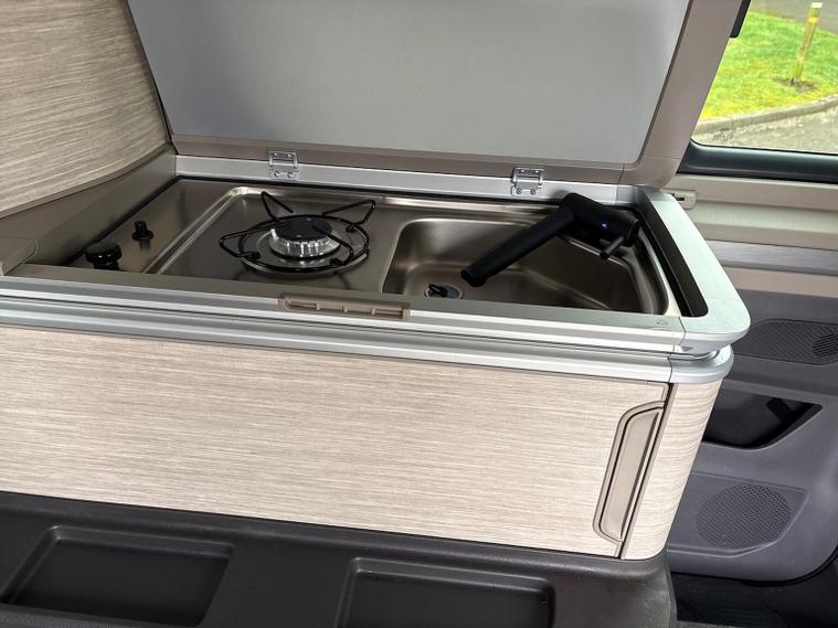 - Camper Interior Lighting Concept with Lighting in the Pop-Up Roof - Tailgate - Ambient Lighting in the Kitchen at Coast-Ocean on the Kitchen Cupboard and Apron Lighting on the Sliding Door Entry Plus Ambient Lighting on the Right and Left