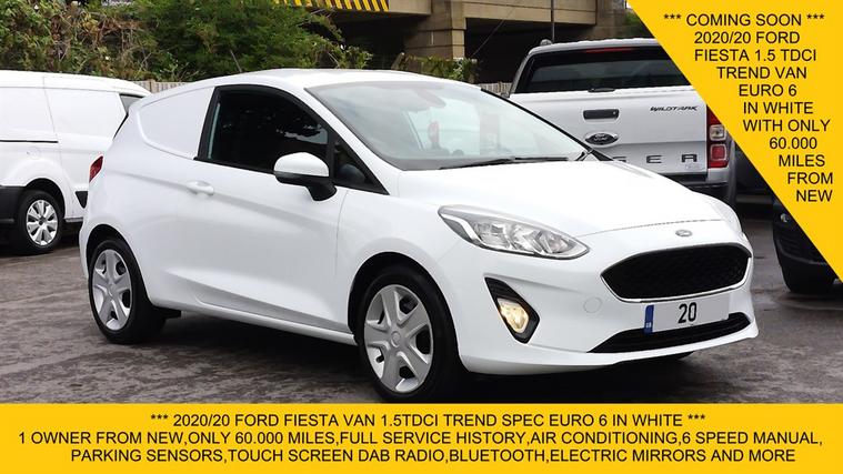 *** COMING SOON *** 2020/20 FORD FIESTA VAN 1.5TDCI TREND SPEC IN WHITE, EURO 6 ULEZ COMPLIANT, 1 OWNER FROM NEW, FULL SERVICE HISTORY, AIR CONDITIONING, TOUCH SCREEN DAB RADIO, PARKING SENSORS, ELECTRIC WINDOWS, 6 SPEED MANUAL, ELECTRIC MIRRORS, BULKHEAD, LINED, AIRBAG, REMOTE CENTRAL LOCKING, BLUETOOTH CONNECTION, GOOD CONDITION THROUGHOUT, A FREE 3 MONTHS WARRANTY WITH THE OPTION TO EXTEND, GREAT FIXED RATE FLEXIBLE FINANCE AVAILABLE, ALL MAJOR DEBIT/CREDIT CARDS ACCEPTED., ALL PRICES ARE PLUS VAT AT 20%