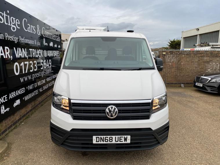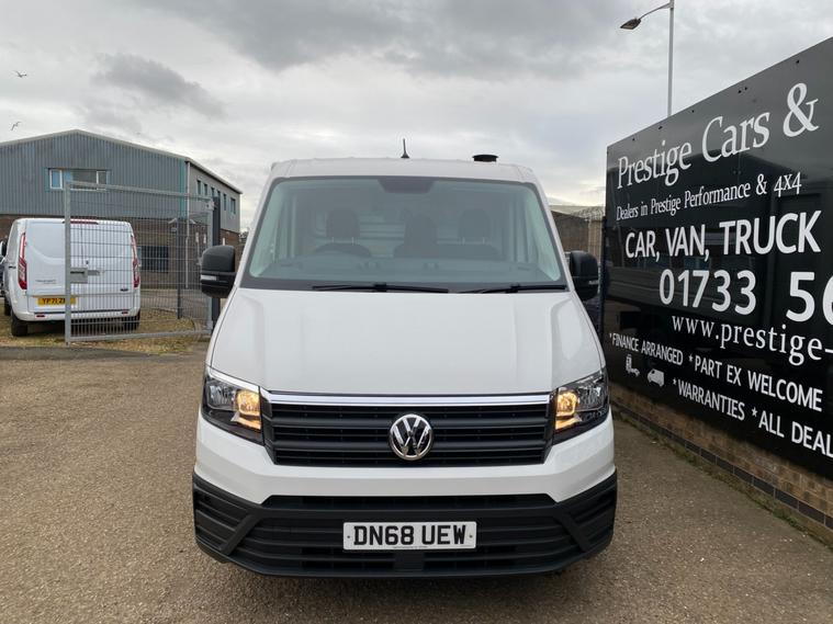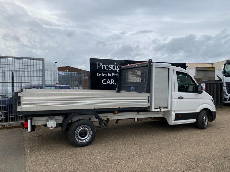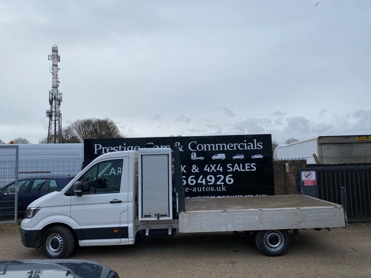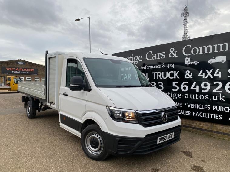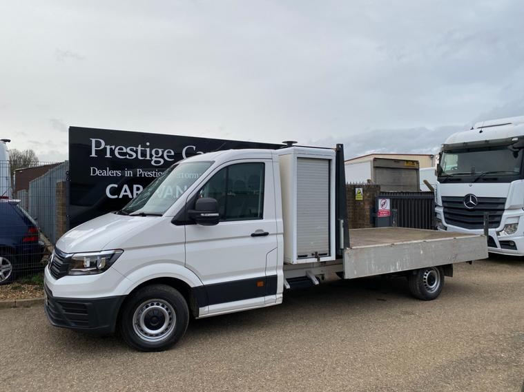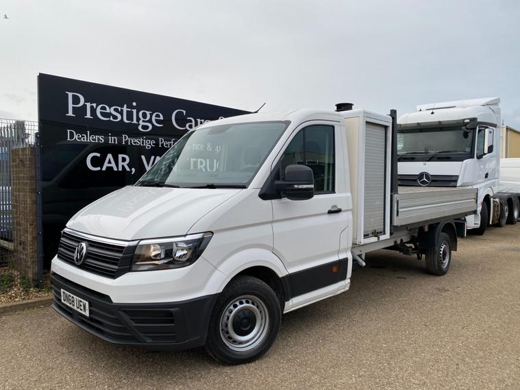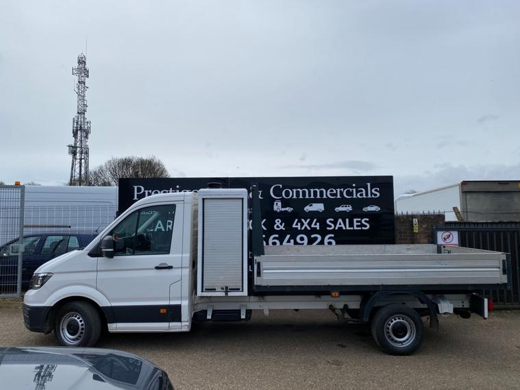 2018 68reg VW CRAFTER CR35 L3 LWB DROPSIDE PICK UP WITH LARGE TOOL STORAGE POD WITH TWIN ROLLER SHUTTERS. 3.5 TONNE 2.0 TDI 140 BHP TURBO DIESEL BLUEMOTION FRONT WHEEL DRIVE 6 SPEED LWB L3H1 GOOD SPEC STARTLINE MODEL. SOLID CANDY WHITE COVERED MEGA LOW MILEAGE OF 49053 BY 1 COUNCIL OWNER FROM NEW. FULL MAIN DEALER SERVICE HISTORY. SUPERBLY MAINTAINED AND LOOKED AFTER WITH NO EXPENSE SPARED, FULL MAINTENANCE PRINT OUT ITEMISING EVERY ITEM OF SERVICE MAINTENANCE AND REPAIRS EVER CARRIED OUT. WILL BE FULLY SERVICED UP TO DATE WITH GENUINE VW PARTS AND OIL INLCUDING FULL CAMBELT KIT AND WATER PUMP WITH NEW DRIVE BELT. CURRENT MOT VALID TILL 18/01/2027. 6 MONTHS NATIONWIDE PARTS AND LABOUR WARRANTY. STANDARD VAN TAX BAND 12 MONTHS PRICED 345 POUNDS. SUPERB ECONOMY 40+MPG ON A RUN. AIR CON. FRONT ASSIST. PARKING SENSORS REAR. TOWBAR AND ELECTRICS. DOUBLE LEAF REAR SPRINGS. LIGHTWEIGHT ALUMINIUM BODY WITH MARINE PLY FLOORING. BODY SIZE IS 3.52M / 11 FOOT 7 INCHES LONG X 2.05M / 6 FOOT 9 INCHES WIDE. BLUETOOTH PHONE AND AUDIO INTEGRATION. SD CARD AUX IN USB MUSIC MEDIA CONNECT. DAB DIGITAL RADIO. ELEC HEATED MIRRORS. ELEC WINDOWS. REMOTE CENTRAL LOCKING. OVERHEAD STORAGE TO CAB. UNDERSEAT STORAGE. DRIVES BEAUTIFULLY. 3000KG TRAILER PULL CAPACITY. 6000KG TRAIN WEIGHT. FULL SIZE SPARE WHEEL. CHOICE OF QUALITY USED HAND PICKED COMMERCIALS IN STOCK NOW. CHOICE OF PANEL VANS, TIPPERS, DROPSIDES, LUTONS, PICK UP'S, CREW CABS, SINGLE CABS ALL IN STOCK NOW.