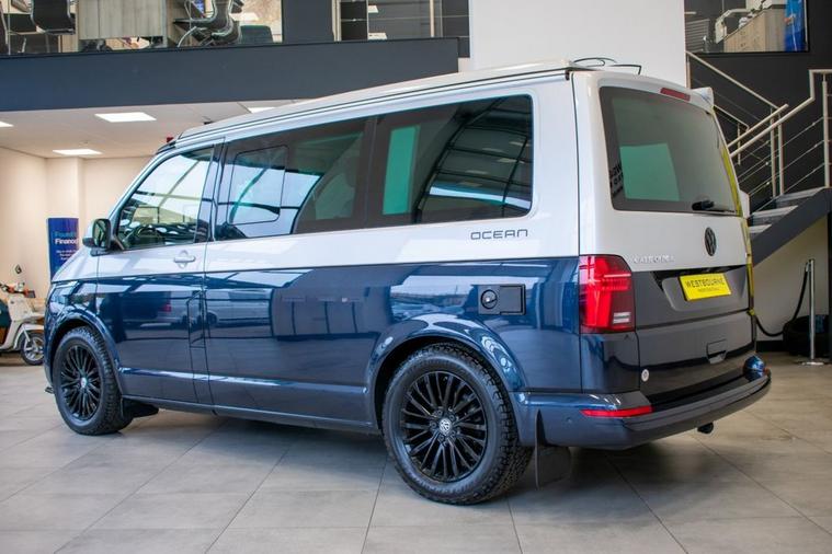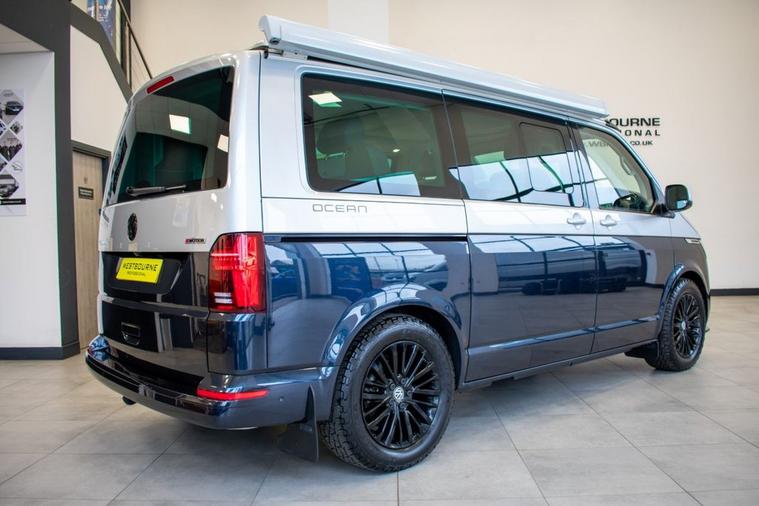 2023 23 Volkswagen California Ocean 2.0 TDI 204ps 4Motion DSG, finished in factory two-tone Reflex Silver over Starlight Blue Metallic. 18-inch Palmerston Alloy Wheels in Black with BF Goodrich Trail Terrain Tyres, Gloss Black Front Grilles, Gloss Black Front Splitter, Electric Sliding Side Door, Electro-Hydraulic Elevating Roof, Discover Media Satellite Navigation System, Heated Front Seats, Digital Dashboard, Park Assist, Auxiliary Heater, Side Awning, Two Burner Gas Hob, Waeco Compressor Cool Box Fridge, Automatic LED Headlights, Hill Descent Control, Adaptive Cruise Control, Front & Rear Parking Sensors, Rear View Camera, DAB Radio, Bluetooth Telephone & Audio Connectivity, Wireless App Connect for Apple CarPlay / Android Auto, DCC with Selectable Driving Modes, Swivel Front Seats, Camping Table with 2 Folding Chairs, Automatic 3-Zone Climate Control, Leather Multifunction Steering Wheel and much more.