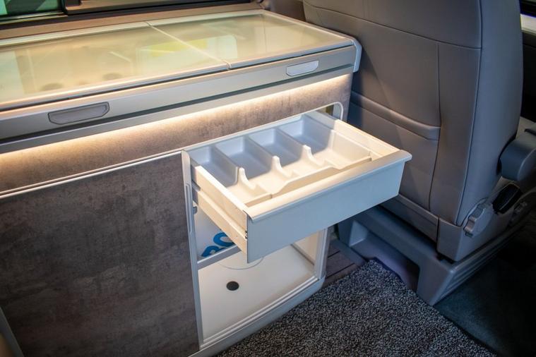 - 230V External Inlet with Charging Feature for Vehicle Batteries and Internal 230V Outlet on the Side of the Kitchen Unit