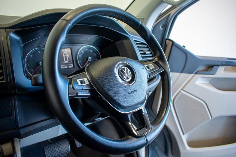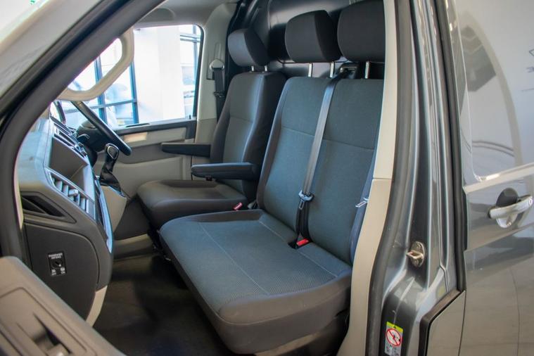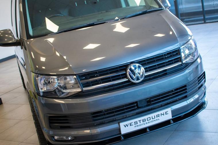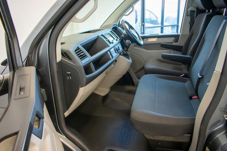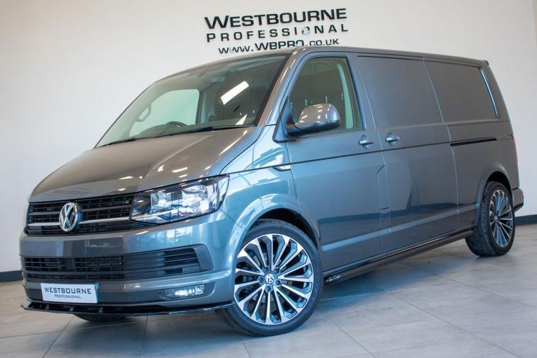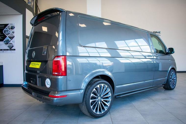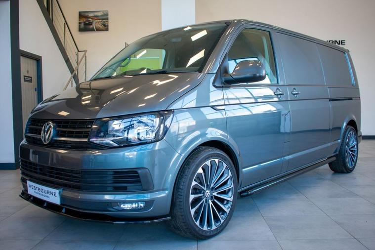 No VAT | 2019 19 VW Transporter T6 T32 2.0 TDI 150ps DSG Highline LWB, finished in Indium Grey Metallic. Presented for sale with our Exterior Styling Package consisting of 40mm Lowering, 20 Alloy Wheels, Gloss Black Front Splitter, Side Bars and Colour Coded Rear Spoiler. Factory Highline model with specification including Rear Parking Sensors, DAB Radio, Bluetooth Telephone & Audio Connectivity, Air Conditioning, Cruise Control, Leather Multifunction Steering Wheel, Heated Windscreen, Electronic Stability Control, Automatic Lights and more.