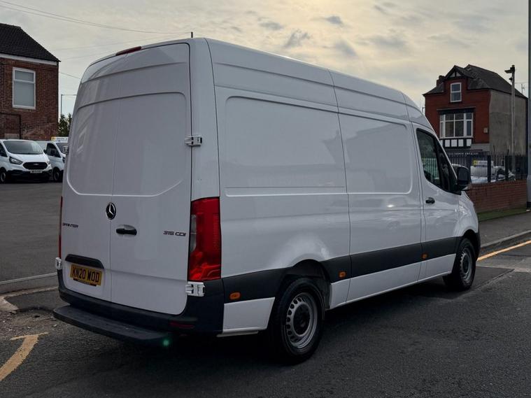 Mercedes Sprinter 316 CDI, Euro 6, MWB, High Roof, 2020 20 Reg, 110 000 Miles (Warranted), Cruise Control, Multi-Functional Steering, On Board Computer, Bluetooth Telephone Kit, 160 BHP, 3 Seater Cab, Side Loading Door, Central Locking, Electric Windows, 6 Speed, Power Assisted Steering, Immobiliser, Apple Car Play, DAB Radio, Drivers Airbag, Head Restraints, Height Adjustable Drivers Seat, Cloth Seat Trim, Factory Fitted Steel bulkhead, Ply lined, ESP, ABS, Traction Control.
