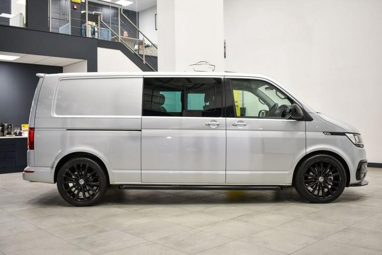 2020 20 VW Transporter T6.1 T32 150ps DSG Highline Kombi LWB, finished in Reflex Silver Metallic. Presented for sale with our Exterior & Interior Styling Packages, consisting of 40mm Lowering, 20 Alloy Wheels, Gloss Black Front Splitter, Gloss Black Front Grilles, Side Bars, Colour Coded Rear Spoiler, Full Premium Leather Upholstery, Carpeted Load Area and LED Interior Lighting. A Highline model, with factory specification including Twin Electric Sliding Doors, Heated Front Seats, 2+1 Split Rear Seats with Easy Entry Feature, Adaptive Cruise Control, App Connect (Apple CarPlay / Android Auto), Front & Rear Parking Sensors, DAB Radio, Bluetooth Telephone & Audio Connectivity, Heated Electric Power Folding Mirrors, Climatic Air Conditioning System, Automatic Headlights with Cornering Function, Automatic Rain Sensing Wipers, Heated Windscreen, Electronic Stability Control, City Emergency Braking System and more. Please enquire using reference #WTU