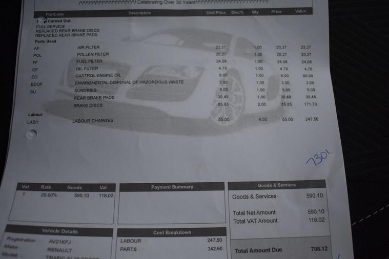 This 2021 Renault Trafic 2.0 dCi ENERGY 28 Sport SWB Standard Roof Euro 6 (s/s) 5dr boasts a clear vehicle history, offering peace of mind for its next owner. Powered by an efficient 2.0 litre diesel engine and meeting Euro 6 emissions standards, this Sport trim model is equipped with a rear parking camera and rear parking sensors to aid manoeuvrability. Inside, youll find manual air conditioning with a pollen filter for a comfortable cabin environment, alongside a DAB radio featuring Bluetooth connectivity, a USB socket, and an AUX input for all your entertainment needs. The inclusion of a wide view mirror further enhances safety by providing blind spot assistance. The Trafic Sport derivative is designed to offer a superior driving experience. Its combination of practical features like the parking assistance systems and the convenience of Bluetooth and DAB radio, alongside the safety benefit of blind spot assistance, clearly sets it apart. This Renault Trafic is a well appointed and reliable choice for those seeking a capable and comfortable vehicle. Low mileage only 79, 000 MILES 100% guaranteed and HPI clear. The road tax is only £335 a year. Great on fuel doing an average of 39 miles to the gallon. This is a One owner vehicle. Being an AA approved dealer we have an independent AA inspector come in and carry out a 128 point check on the car. We supply a fantastic sales package with the vehicle which includes 12 months MOT, an essential service, 3 months warranty and 12 months breakdown cover. With brilliant reviews and a 5 ramp workshop behind us, you can buy with peace of mind. We are open 08:30 to 17:00 Monday to Friday and 09:00 to 16:00 Saturday. Call 01842232473 to arrange a viewing and test drive