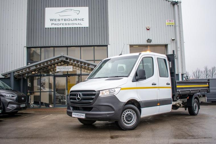 2023 23 Mercedes-Benz Sprinter 314CDI L3 Double Cab 7 Seat Tipper. Features include CPD Tipping Body, Tow Bar, LED Beacon, Bluetooth Telephone & Audio Connectivity, DAB Radio, Apple CarPlay / Android Auto, Cruise Control, Multifunction Steering Wheel, Automatic Lights, Electric Windows, Keyless Start and more. A one owner vehicle direct from a corporate fleet, serviced prior to sale and supplied with the balance of Mercedes-Benz warranty to April 2026. Euro 6 / ULEZ / CAZ Compliant.