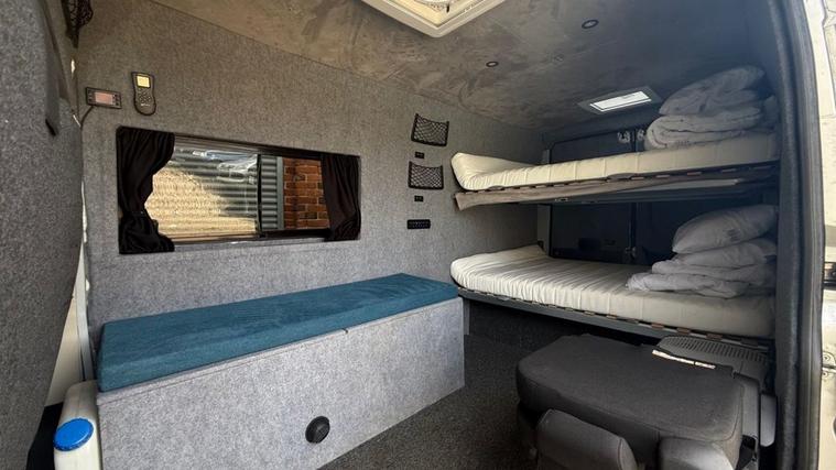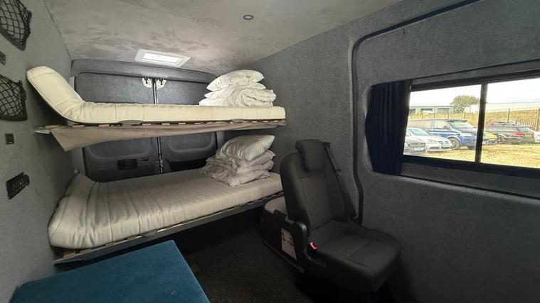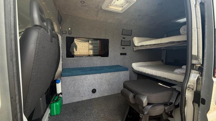 This is a camper converted van ideal fora family of 4 or for a race team. Equipped with 2 double bunks at the rear, storage and loads of space its the ideal van for a getaway on a weekend.