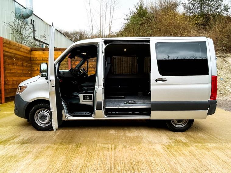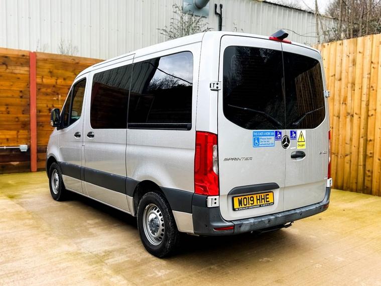 This TBC Conversions Mercedes Sprinter Wheelchair Accessible Vehicle (WAV) has 4 Seats (2 Front and 2 Rear). Equipment includes Wheelchair Lift, Power Opening Rear Door, Driver Transfer Seat, Reversing Camera, Rear Heater, Air Conditioning, Electric Front Windows, Electric Adjustable Wing Mirrors, Power Steering, Remote Central Locking, Tinted Rear Windows.