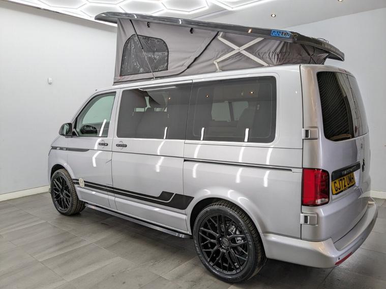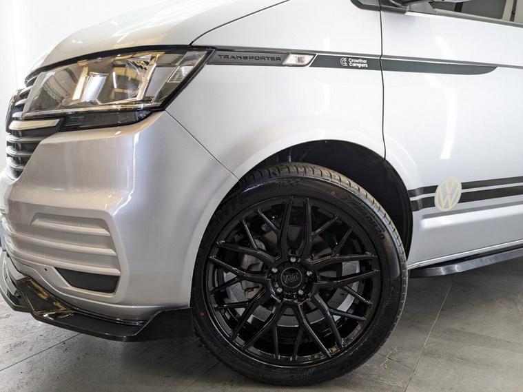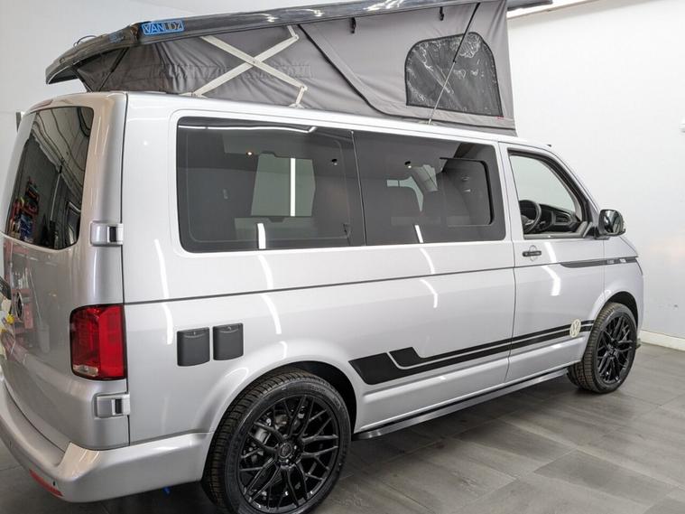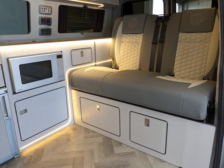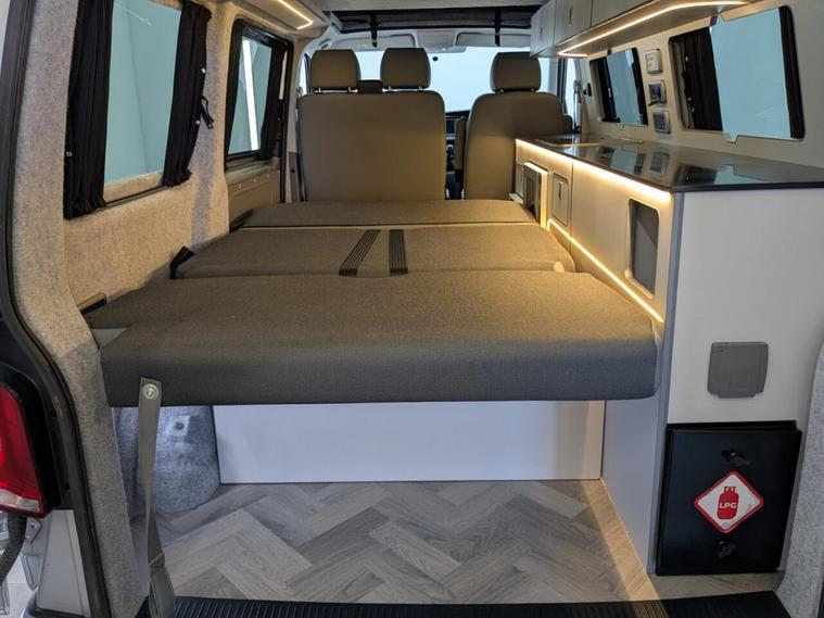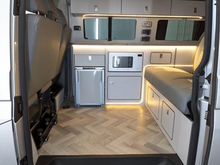 Reflex Silver with Custom Graphics Custom leather seats Skyline roof Side bars 20 inch load rated alloy wheels Front splitter Night heater Custom worktop Full soft-close custom furniture Loc8 table Custom LED interior lighting Water tank Rib bed with Isofix, fully crash tested USB and 230v sockets Camper spec microwave Refrigerator with freezer compartment Pressurised rear shower Bluetooth telephone connectivity Parking sensors Privacy glass all round Extended warranty available As the build is still in progress, you still have time to customise some of the finishes and details to suit your style. Please note, final colours are not yet confirmed.