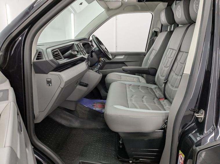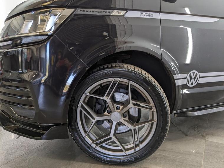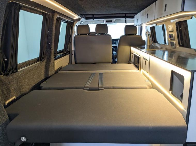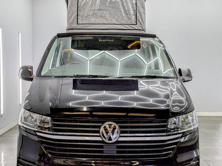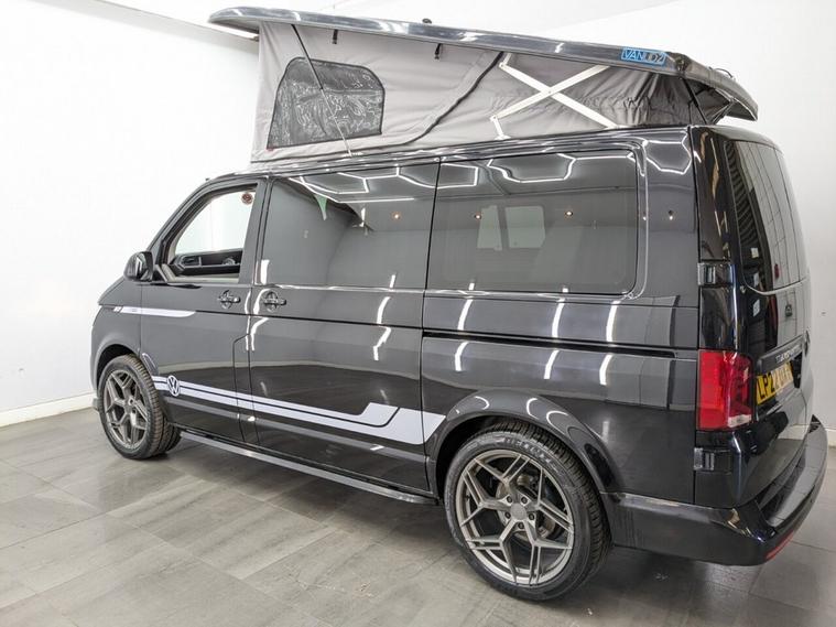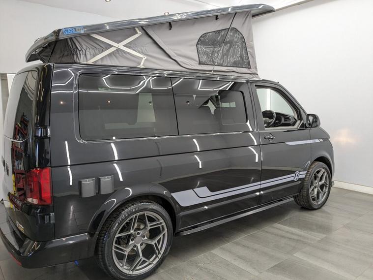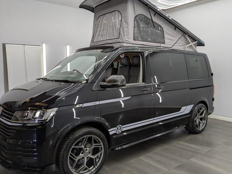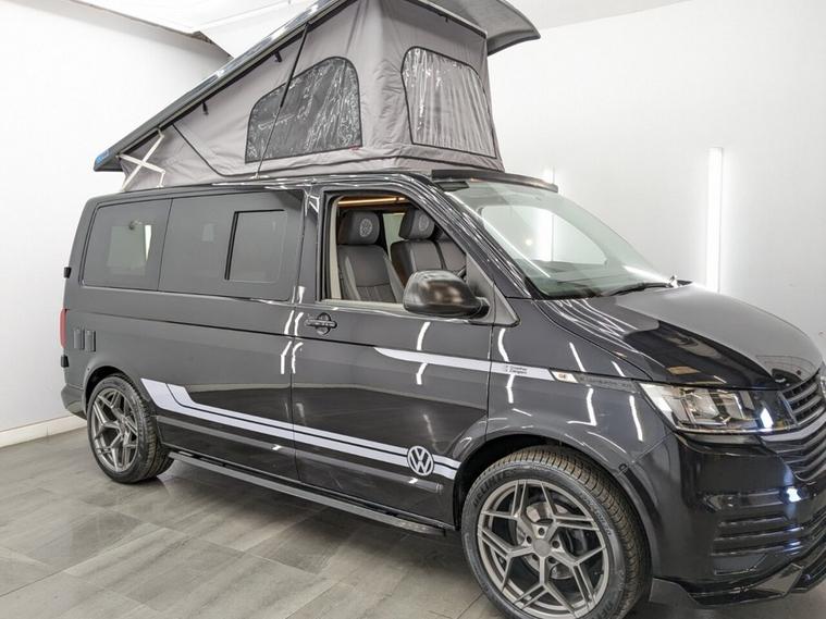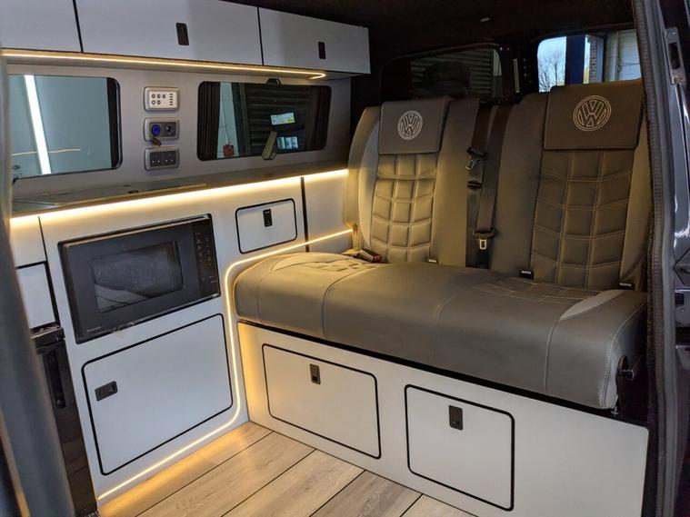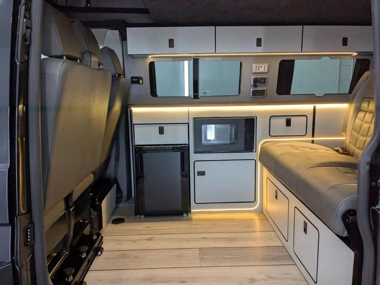 STUNNING VW TRANSPORTER CAMPER VAN CONVERSION READY FOR ADVENTURE HIGH SPEC BUILD Finished in Deep Black with Custom Graphics, this beautifully crafted VW Transporter camper conversion is a real head turner, combining premium styling with a practical, high-end living space. Built to an exceptional standard, this van is ready to drive away and enjoy immediately whether its weekend getaways or full touring adventures. Inside, the van features custom leather seating and a fully professionally designed interior with full soft-close custom furniture, giving it a luxury feel throughout. The layout has been thoughtfully designed to maximise both comfort and usability, complemented by a custom worktop, Loc8 table, and custom LED ambient interior lighting creating a modern and inviting atmosphere. This is a true off-grid capable camper, equipped with a VanLidz roof with a 180 watt solar panel, USB and 230V sockets, and a full electrical setup to keep you powered wherever you go. The kitchen area includes a twin hob with sink unit, camper spec microwave, refrigerator with freezer compartment, and integrated water system with a water tank and pressurised rear shower, making it perfect for longer trips. Sleeping is taken care of with a premium RIB bed with ISOFIX, fully crash tested, offering both safety and comfort for you and your passengers. For year-round use, the van is also fitted with a night heater, ensuring you stay warm even in colder conditions. Externally, this camper looks just as impressive, sitting on RIVERA 2026 multi-spoke 20 load-rated alloy wheels, complemented by side bars, a front splitter, and privacy glass all round, giving it a sleek and aggressive stance. Additional features include Bluetooth telephone connectivity and parking sensors for everyday ease of use. This is a standout, professionally converted VW camper that offers style, comfort, and practicality in one complete package. Extended warranty available for added peace of mind.