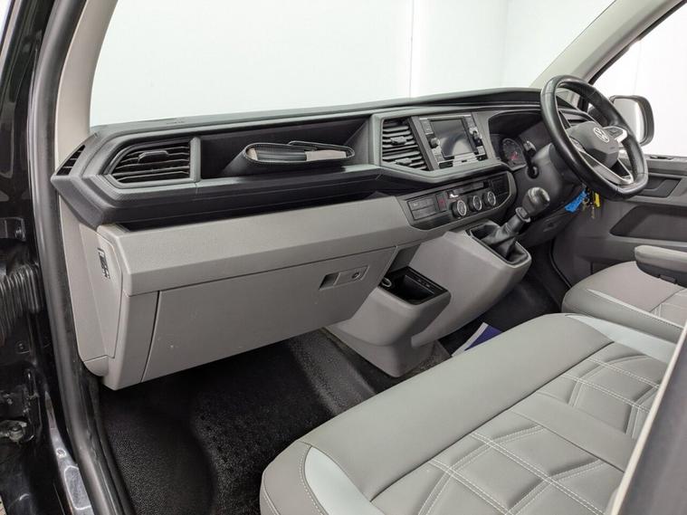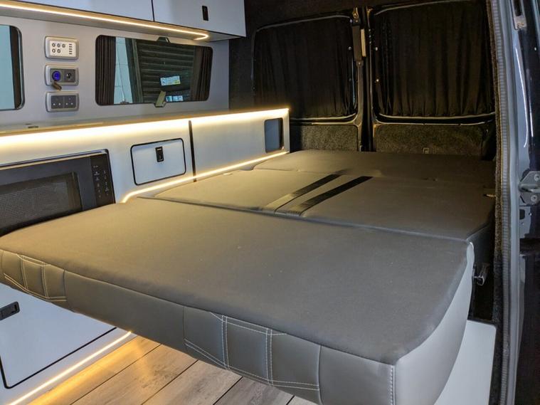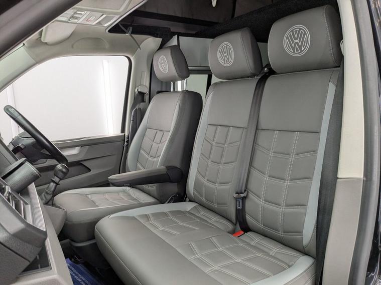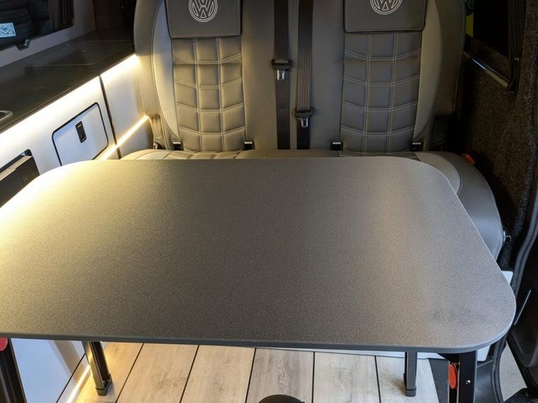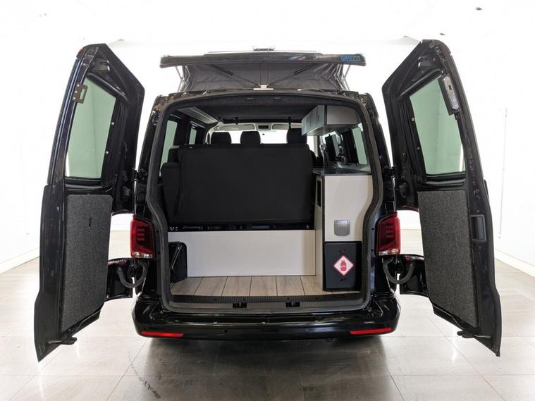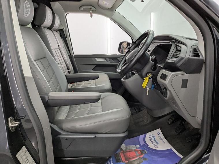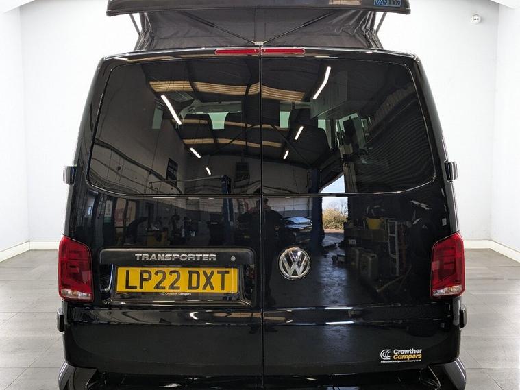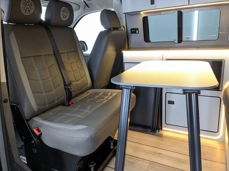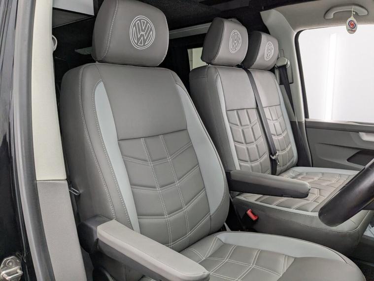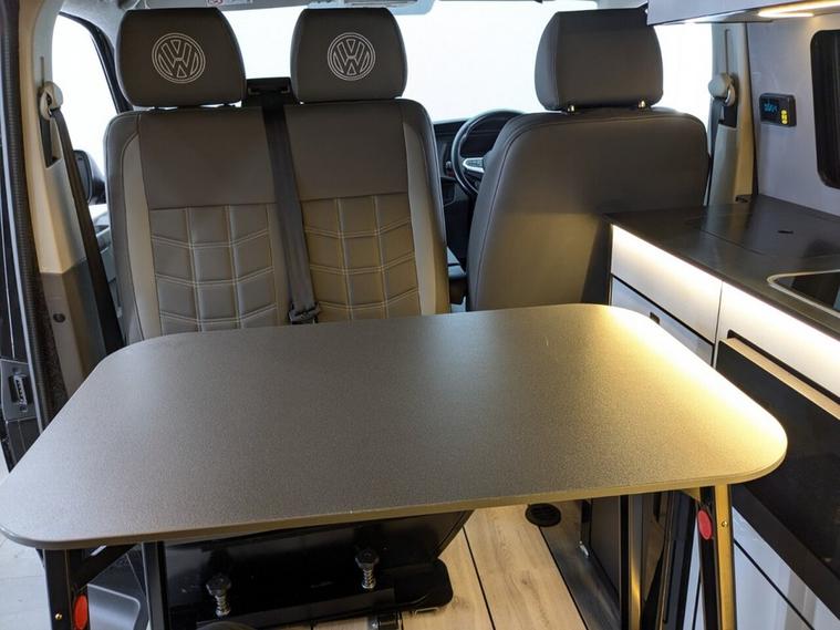 STUNNING VW TRANSPORTER CAMPER VAN CONVERSION READY FOR ADVENTURE HIGH SPEC BUILD Finished in Deep Black with Custom Graphics, this beautifully crafted VW Transporter camper conversion is a real head turner, combining premium styling with a practical, high-end living space. Built to an exceptional standard, this van is ready to drive away and enjoy immediately whether its weekend getaways or full touring adventures. Inside, the van features custom leather seating and a fully professionally designed interior with full soft-close custom furniture, giving it a luxury feel throughout. The layout has been thoughtfully designed to maximise both comfort and usability, complemented by a custom worktop, Loc8 table, and custom LED ambient interior lighting creating a modern and inviting atmosphere. This is a true off-grid capable camper, equipped with a VanLidz roof with a 180 watt solar panel, USB and 230V sockets, and a full electrical setup to keep you powered wherever you go. The kitchen area includes a twin hob with sink unit, camper spec microwave, refrigerator with freezer compartment, and integrated water system with a water tank and pressurised rear shower, making it perfect for longer trips. Sleeping is taken care of with a premium RIB bed with ISOFIX, fully crash tested, offering both safety and comfort for you and your passengers. For year-round use, the van is also fitted with a night heater, ensuring you stay warm even in colder conditions. Externally, this camper looks just as impressive, sitting on RIVERA 2026 multi-spoke 20 load-rated alloy wheels, complemented by side bars, a front splitter, and privacy glass all round, giving it a sleek and aggressive stance. Additional features include Bluetooth telephone connectivity and parking sensors for everyday ease of use. This is a standout, professionally converted VW camper that offers style, comfort, and practicality in one complete package. Extended warranty available for added peace of mind.