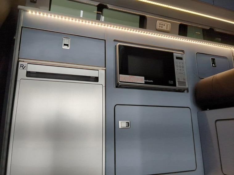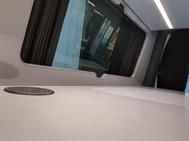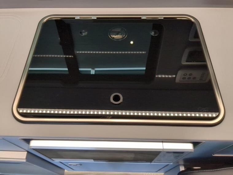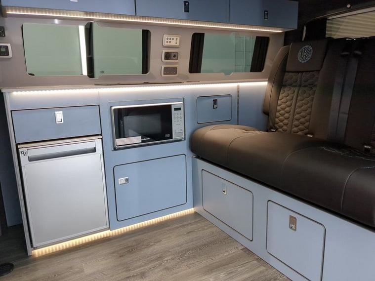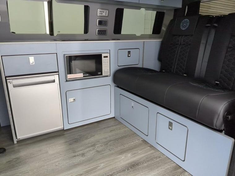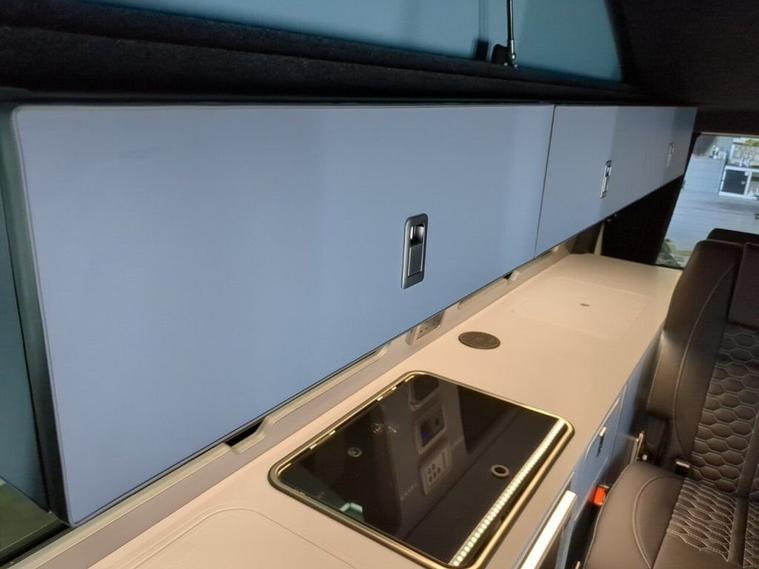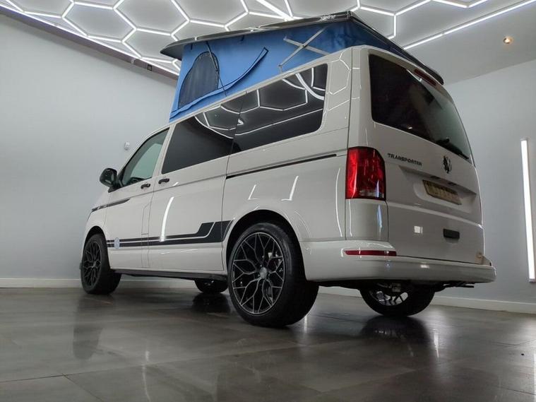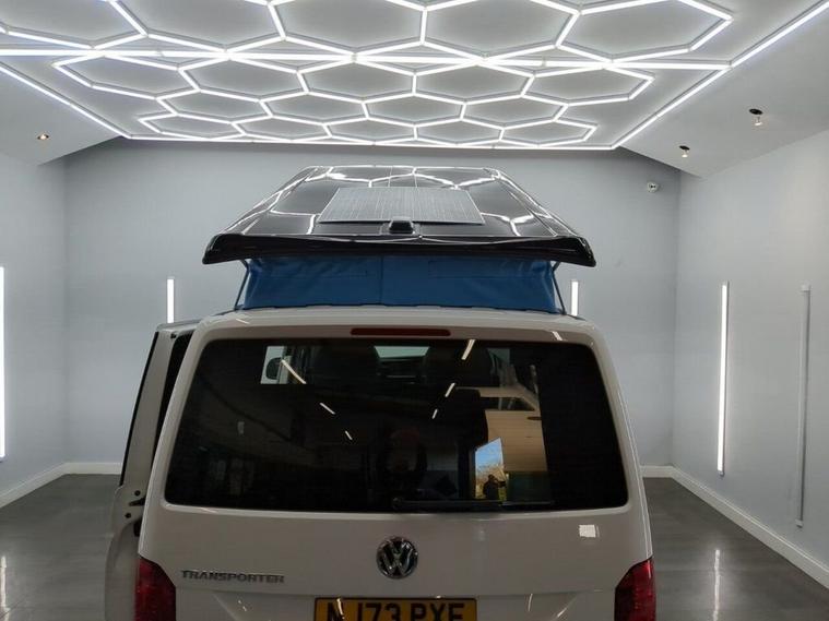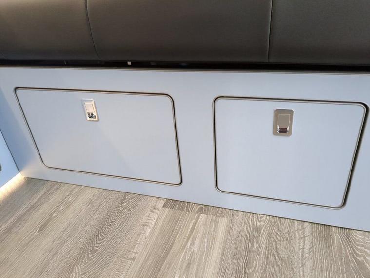 Finished in stunning Candy White with eye-catching Graphics a real head-turner. Four berth conversion with warranty for total peace of mind this one truly stands out from the crowd. Manual transmission, luxury Black Leather interior, Swivel front captains sports seats, 20 inch Branded extra-load alloy wheels, Black side bars, Front splitter, Rear parking sensors, Underslung LPG tank, Propex gas heater, Air conditioning, high-spec entertainment system with Bluetooth telephone connectivity and App Connect perfect for life on the road, 230V Hook Up, 230V and USB Sockets, Skyline roof, Solar panel, Opening Balcony window and side windows, Shower connection point. Underslung LPG tank with barbecue and fire connections ideal for outdoor living, Reading Lights, Sink unit, Refrigerator, Gas Hob, Microwave, Loc8 detachable table, Water Storage. Loads of cleverly designed storage throughout including under-bed storage, Rib bed, Factory fit leisure battery, modern LED ambient interior lighting system. Stunning Aquamarine hand-made units finished to a premium standard, Grey Corian worktop, Grey splashback with integrated control panel, Weathered timber flooring, Black curtains a truly high-end finish throughout.