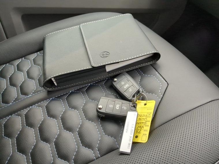- Black Leather Upholstery with Blue Stitching and VW Logos