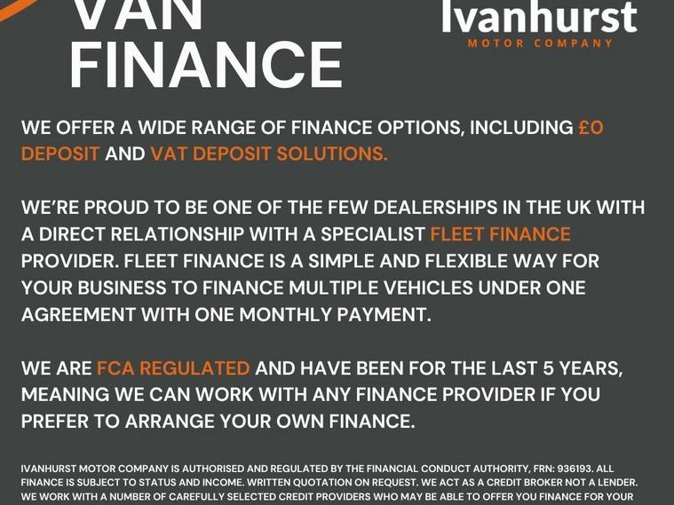 Ivanhurst Motor Company is an independently owned and ran car and van dealership conveniently based in central Essex. We pride ourselves in our customer service. Every one of our vehicles undergoes a 108 point pre delivery inspection to check items such as; Brakes Tyres, Lights and Fluid Levels. If a car has less than 9 months MOT, we put a new MOT on the vehicle, which will be supplied to you with no advisories. Likewise if the vehicle was last serviced more than 9 months ago, we will service the vehicle for you. Ivanhurst giving this level of service means we are one of only a handful of Trading Standards Approved garages in the area. Is there any additional ‘Admin Fees’? NO! We do not charge an ‘Admin Fee’ for doing our job! We give a 3 month / 3000 mile warranty on all commercial vehicles. Our Mechanical Parts and Labour warranty is applicable nationwide at any VAT registered garage. Extended warranties available up to two years on commercials with unlimited mileage, £1000 claim limit per claim with unlimited claims and a 10% excess on the claim to use. Need vehicle finance? Not a problem. Ivanhurst has direct links to Close Motor Finance and Blue Motor Finance. We also use our broker - Finset, who are able to cater for the whole spectrum of credit ratings and can even finance a vehicle with £0 deposit! We really hope breaking down what we do as a business gives you peace of mind when choosing us to supply your new vehicle. We appreciate it can be a daunting prospect, call us to discuss your requirements. It is our job to assist, advise and help you..