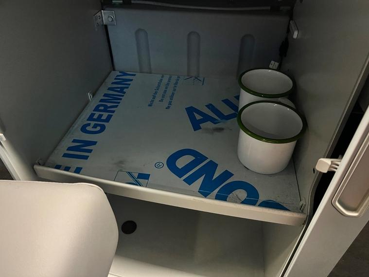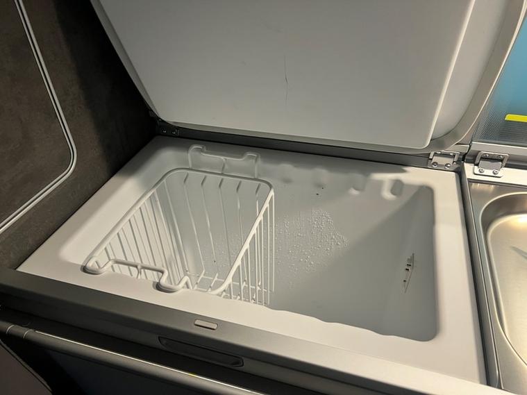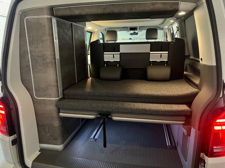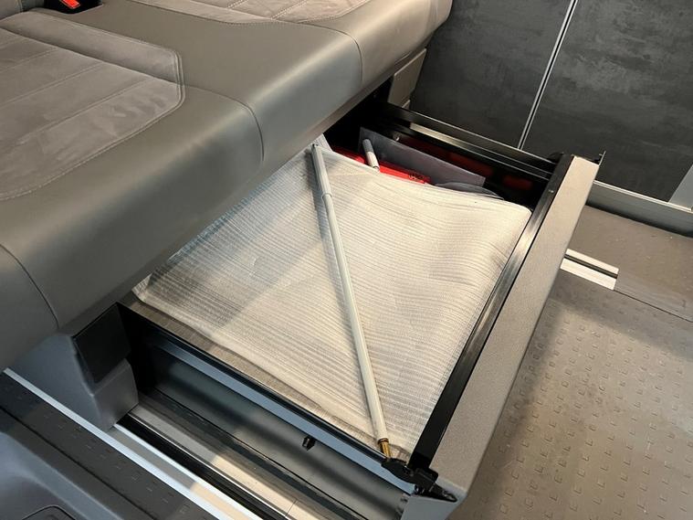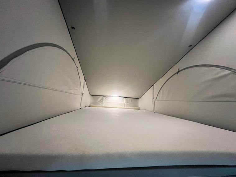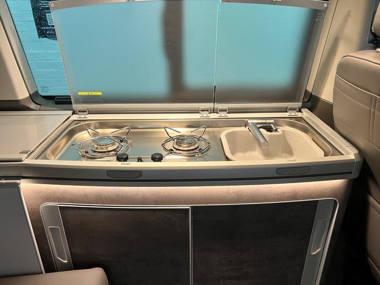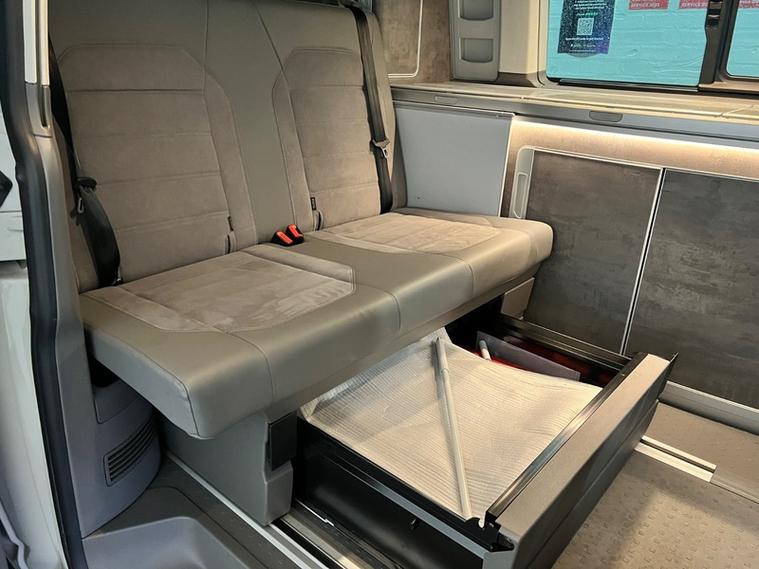 As a true California Ocean, it comes equipped with thoughtful camping comforts including a bed extension with a comfort sleeping mat, delivering improved support and additional sleeping space. An awning rail with black awning housing offers quick setup for outdoor living, making this camper perfect for weekend adventures or extended trips.