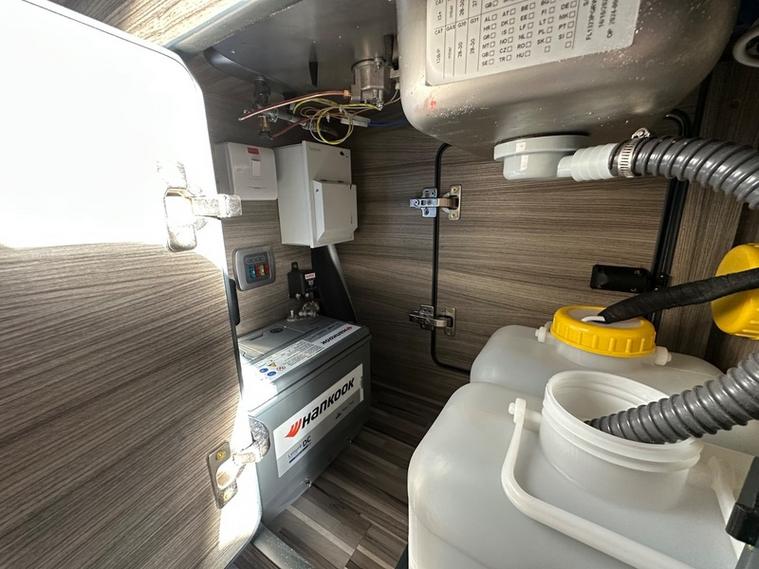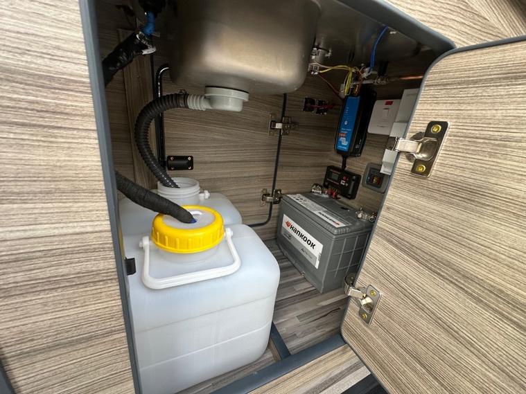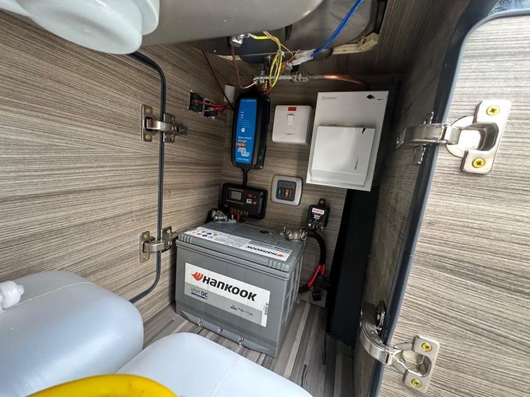 It has 240v hook up, 12v leisure battery and a gas locker, PLUS Solar Pannal for fee electric.