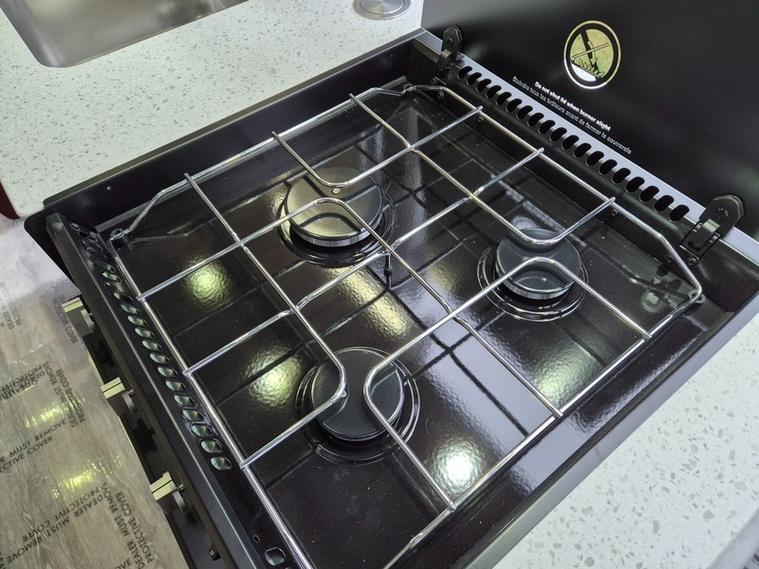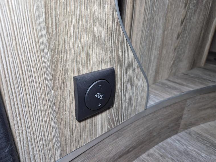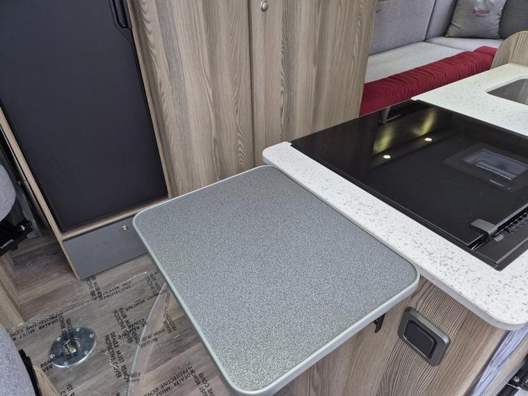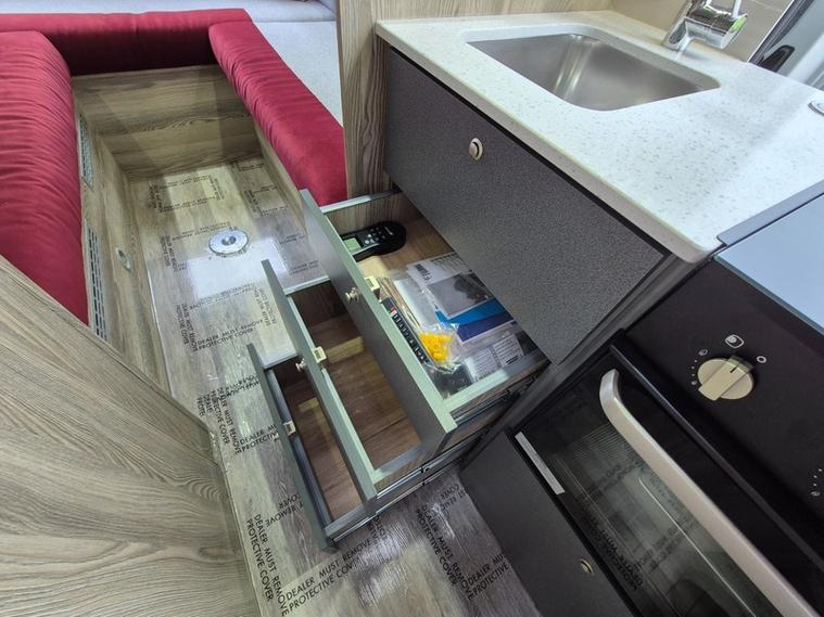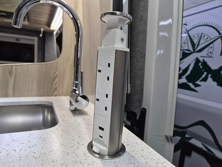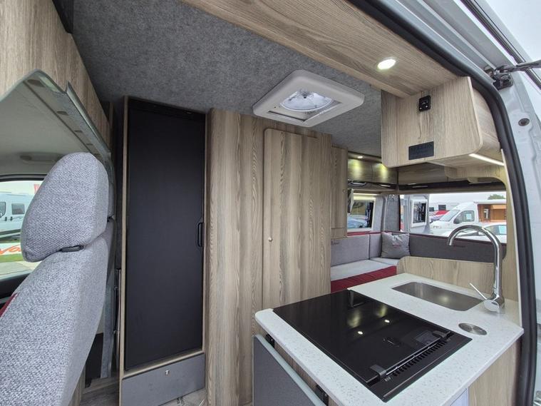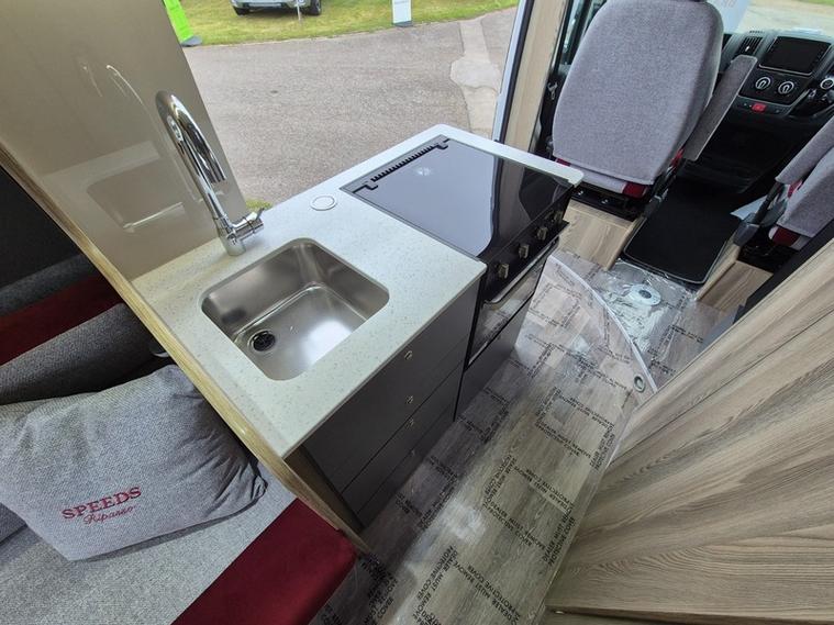 The well-equipped kitchen consists of a stainless counter sunk sink with hot and cold taps, abundant worktop space complemented by pull-up worktops on either side, multiple storage drawers and cupboards and a recessed power tower. It's furnished with a Thetford Triplex 3 burner gas hob/grill and oven, alongside a generous 149L Thetford Compressor Fridge. Additionally, a large electric remote-controlled Maxxfan ensures ventilation and extraction above the kitchen area.