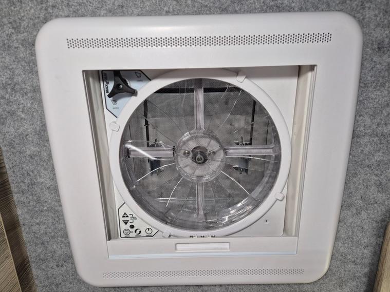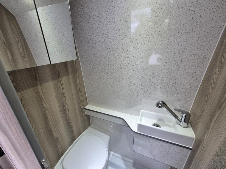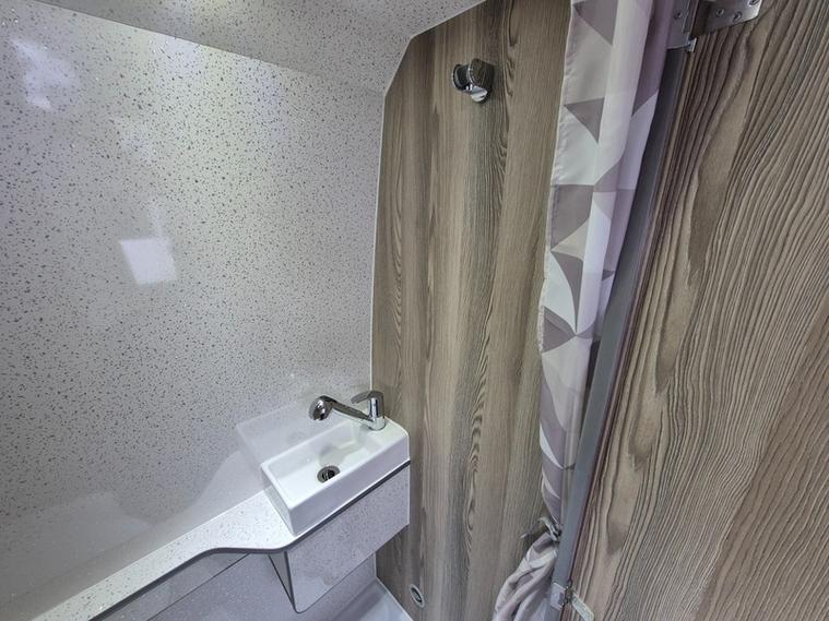 Enjoy the extra-large washroom featuring a Thetford electric flush toilet, a mono mixer shower with curtain, a vanity storage unit, a heating outlet, and a roof extraction vent.