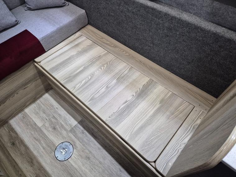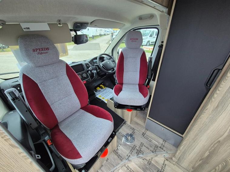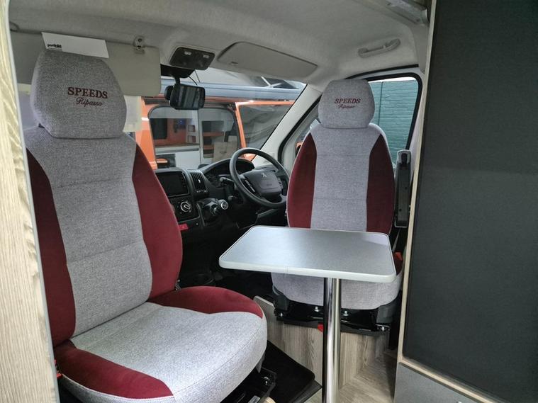 The front cab area boasts twin captain?s swivel chairs upholstered in the exclusive Ripasso fabric trim. A convenient small dinette table is stored above the cab for added functionality.