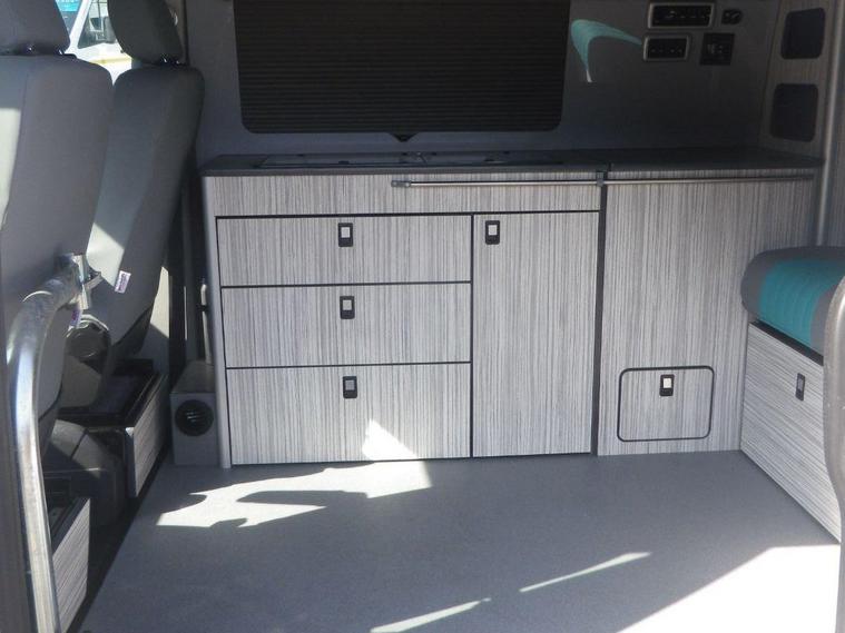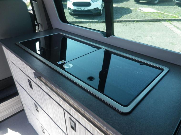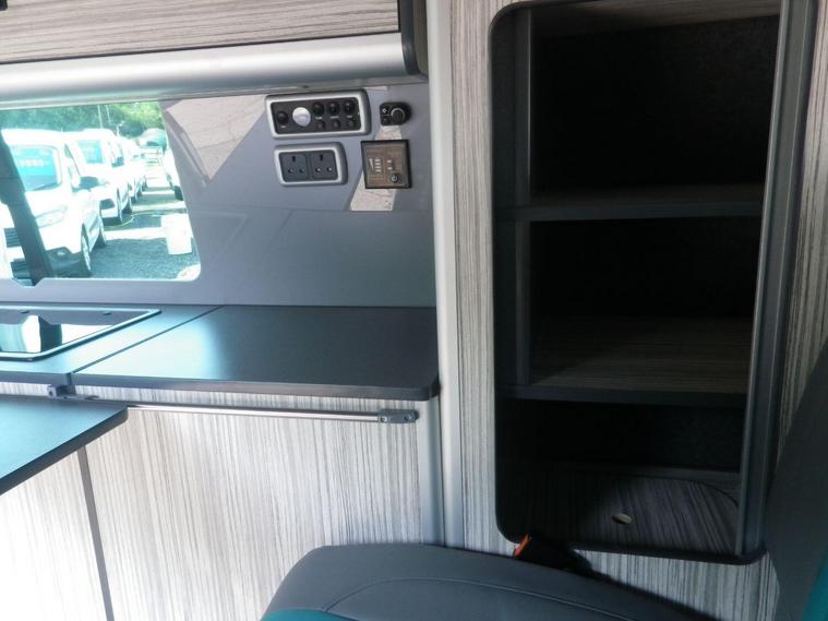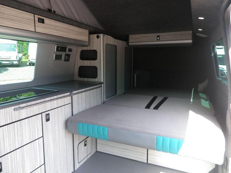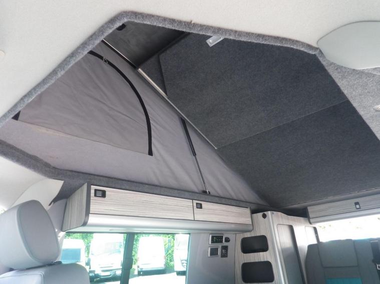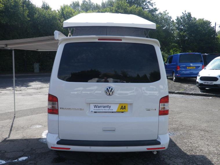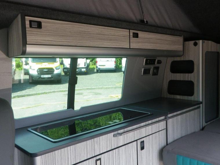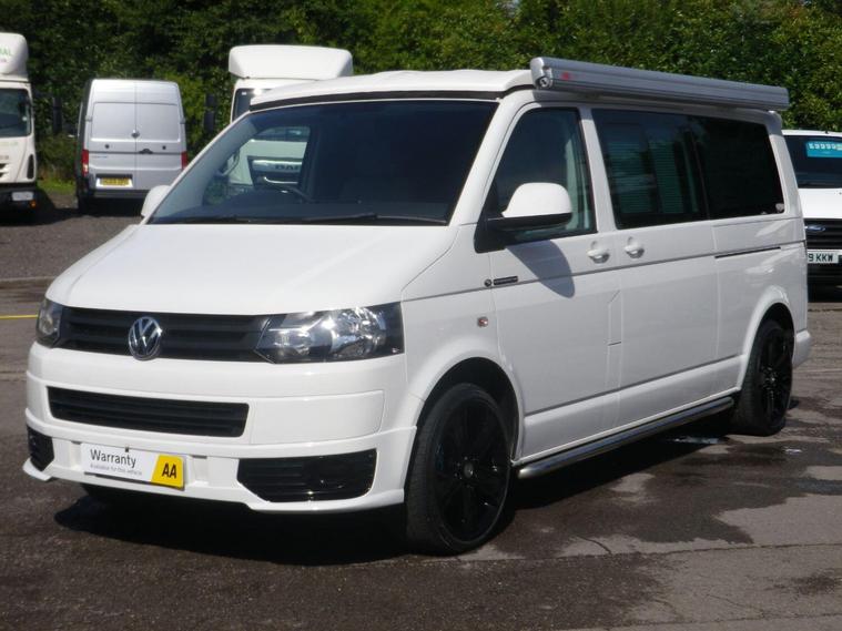 Volkswagen Transporter T32 Trendline 140PS LWB Auto 4 Berth Camper - Full T1 Conversion with Skyline Pop up roof. This houses a roof bed to sleep two people. The roof bed will push up when not in use, allowing extra head room in the camper. Rear seats convert to double bed, Swivelling front seats, Custom Leather Upholstery, Kitchen area that includes two burner gas hob, Fridge, Sink, Loads of Storage with soft closing drawers, Roller Blinds and limousine tint. Large Fiamma F45S Sun Canopy, 20 Inch Gloss Black Ally Wheels. Chrome Side bars. Only 34995 No Vat, Call 01443852192 for full specification. Features to include:, Austin Cloth Upholstery, Driver Seat with Lumbar Adjustment, Drivers Seat with Height Adjustment, Front Electric Windows, RCD Radio/CD, 16in Steel Wheels, Door Mirrors - Electrically Heated and Adjustable, Full Size Spare Wheel, Power Socket, ABS, Airbag Driver, Central Door Locking - Remote, EBD, ESP, Front Passenger Airbag, Head Restraints, Hill Hold Assist, Immobiliser, Power Assisted Steering, Third Brake Light, Traction Control System (TCS), Tyre Pressure Control